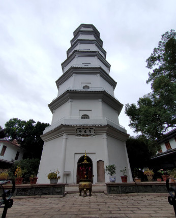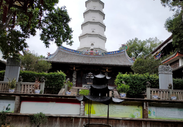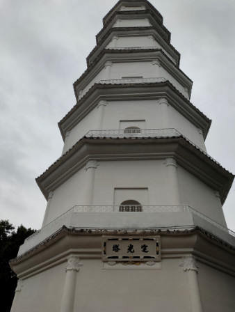 殿后是一座白塔,原名报恩定光多宝塔,是闽王王审知为父母祈福所建。它的建造年天是唐天祐元年,这座唐代样式的宝塔并不高大雄伟,塔高七层,通体白色,看着素是素雅大方。相传在辟基的时候发现了一颗光芒四射的宝珠,因此取名定光塔。初建的时候塔内砌砖轴,外面环着木质的楼阁。这座塔高66.7米的砖心木塔,据说每一层的斗拱、云楣、柜梁和栏杆都精雕细刻,塔壁和门扉都绘着佛像。