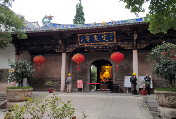 在入口的另一侧是定光寺,山门不算显眼,不过里面的建筑看起来很精致。天王殿的四大天王自不用说,倒是正中供奉的菩萨看着眼生。