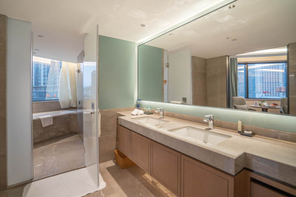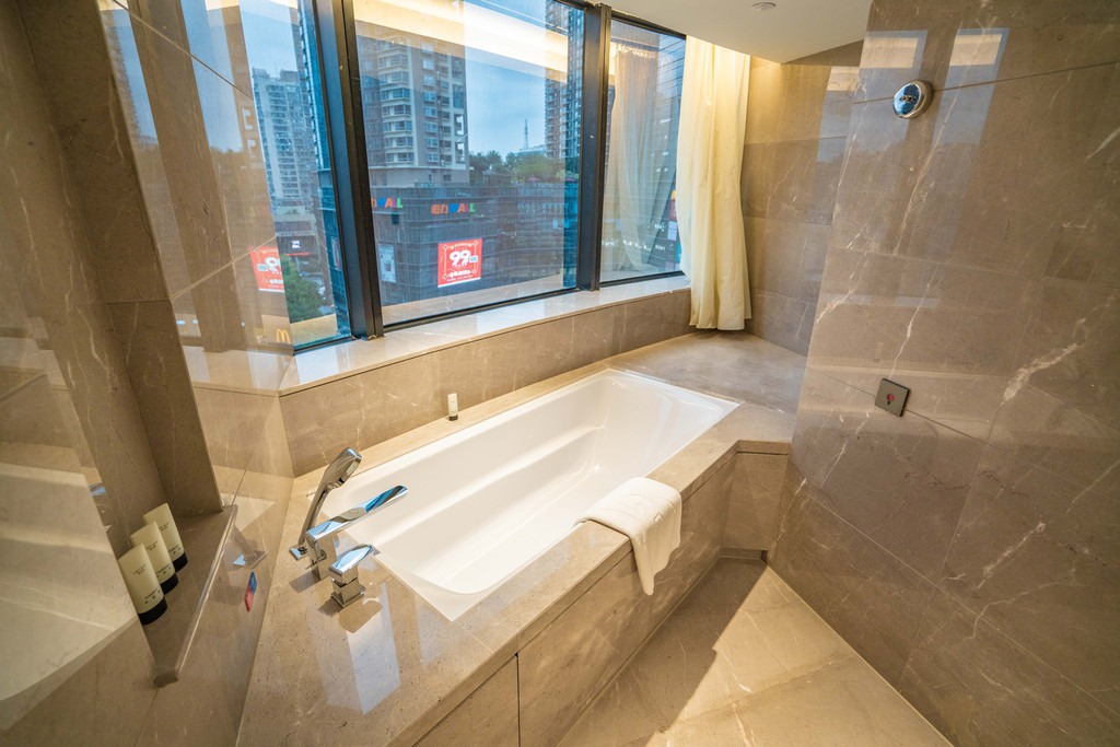 卫浴间三分离,拥有一面超大的镜子,马桶也采用了现代智能马桶。淋浴间里的超大浴缸就在窗边,旅途劳顿,边欣赏福州夜景边泡热水澡是再惬意不过的事情了。