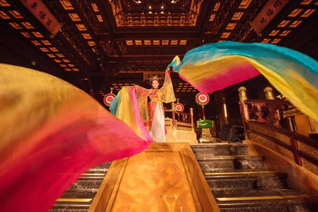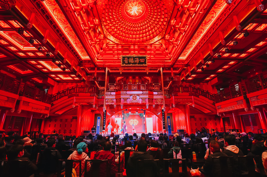 闽商会馆分前后两部分,前部分主要讲述闽商的起源发展及影响,提倡敢打敢拼的闽商精神,激励着每一个福建人前仆后继。后半部分是一个戏楼,仿佛看到了电视里的戏楼跳脱到了眼前,坐在凳子上,旁边的茶几再摆上几道小食,边喝茶边看戏,画面感十足。