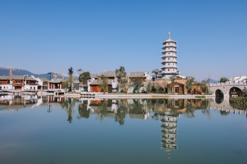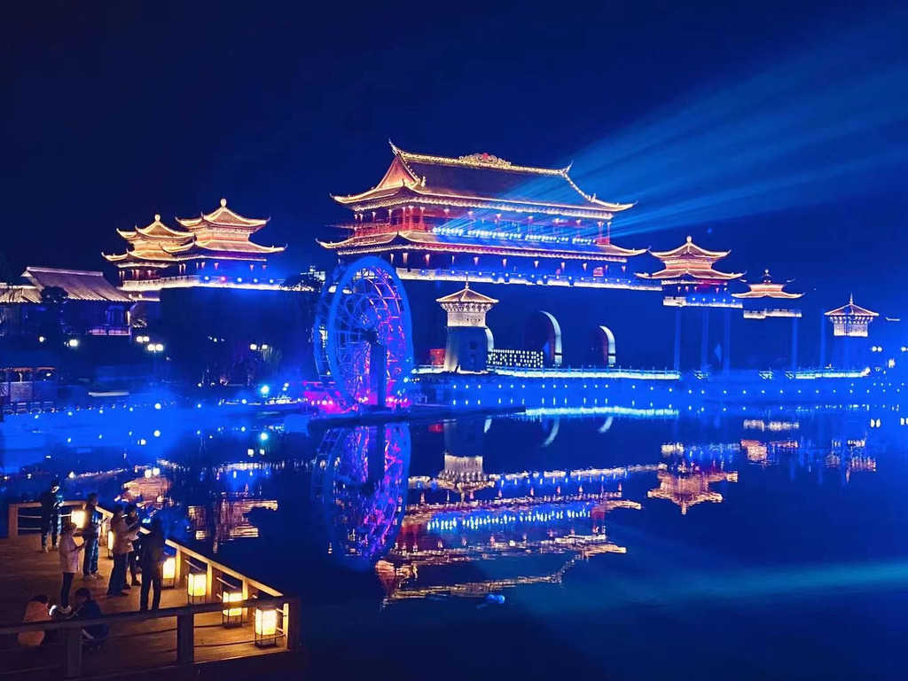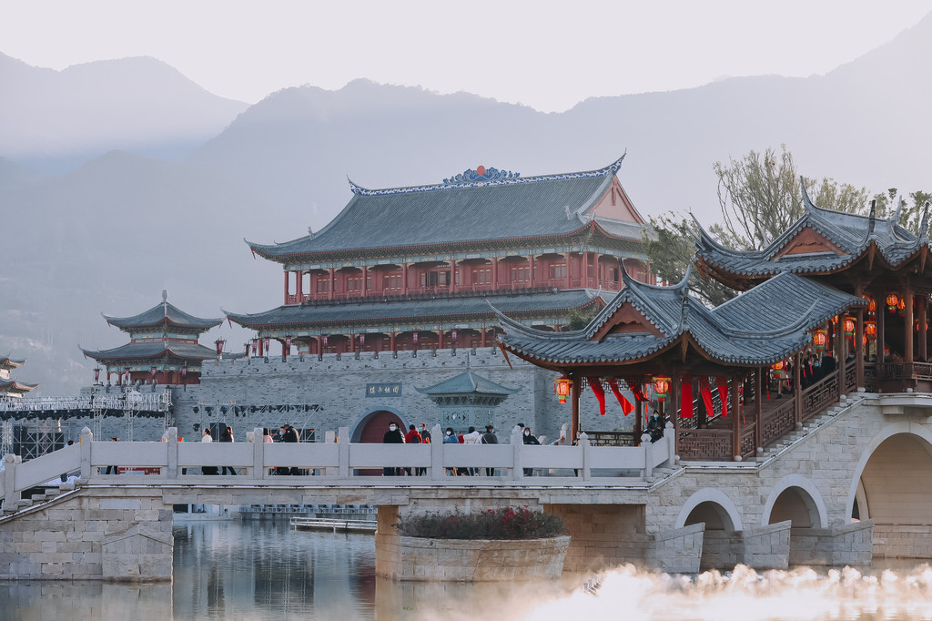 从城楼出来,感觉就换了天地了,不再是庄重的场景,而是婉婉而雅的江南水乡气息,眼前一片湖,旁有一棵大榕树,一座石桥横跨湖两岸,水波荡漾,音乐响起,还有水秀表演,阳光下还看到了彩虹。