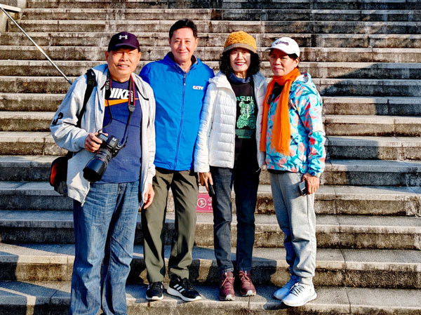 登山虽累,但是途中观景的同时说说笑笑,时不时的又驻足拍照,多少分散了气喘吁吁的注意力,经过十几分钟就到达了半坡亭,这是距离山顶的一半路途。在此小憩后不久,记者与刘峻和周长满一行,一鼓作气登上了山顶,来到了瑞云洞前。