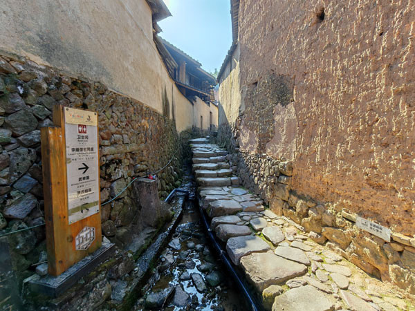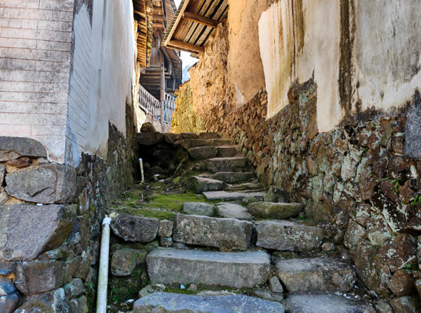 桂峰村地势崎岖,各座建筑之间的距离相对窄小,需用大量的石材构筑护坡,就形成了各条曲径通幽的小巷。为便于行走,又在各小巷的路面铺上石板条,有路皆石,形成独特路面的石建街区。