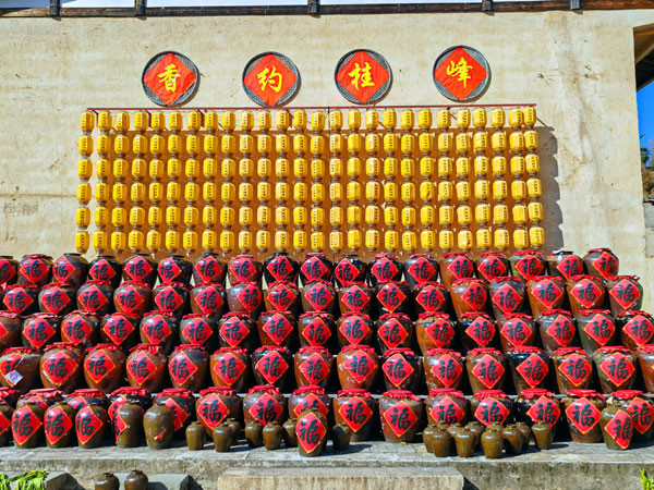 如今,在进村口不远处的“桂峰金秋”的几处伞状粮垛和“香约桂峰”红黄赫三色组成的众多酒坛的景象,不由得令人想起丰收时节的盛况。特别是酒坛子上红底黑字的“福”字,特别喜兴,让人赏心悦目。