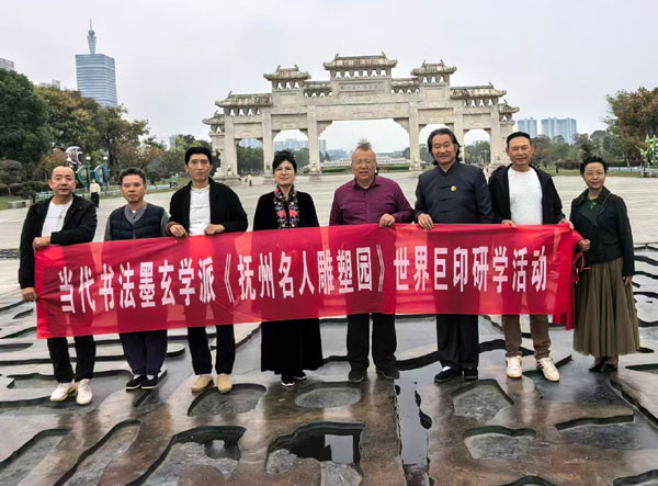 中华新闻通讯社/中华时报10月27日讯(记者 冯赣勇)2025年10月26日,一场别开生面的研学活动,在江西省抚州市府广场的《抚州名人雕塑园》展开。当代书法学派开宗立派者、著名书道家墨玄子,携手墨玄学派创始人、婉约派诗人玄宜,世界基尼斯之最获得者、著名篆刻家、墨玄导师王银茂及夫人林婕,江西抚河风文化创始人、墨玄教师胡丽,赣藉画家、墨玄教师刘崇简,抚州云济堂筋骨康养专家、墨玄教师董万金等一众墨玄弟子齐聚于此,共同对《抚州名人雕塑园》的世界巨印进行深入研学。