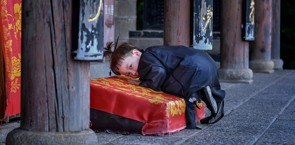 上崆峒山的路线有好几条,想要在一天游完,最佳的方案是坐观光车直接上香山,那里是崆峒山景区的最高峰,从上往下玩,避免了爬“上天梯”,这样省力、省时。其实这个方案是平凉旅游局的丁主任告诉我的。与我同车的,有对夫妻带一着道服的小萌娃,我就打趣地问她:你上山是来学武功的吧?她笑哈哈点着头。我也乐了,心想:我有小模特拍了。