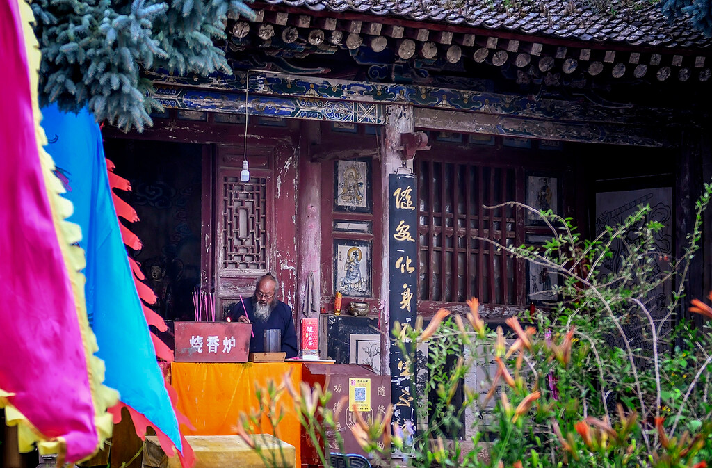 来到塔院,见一僧人,双手合十,围绕着宝塔在做功课,我们不便打扰,只远远的观看,他似乎也无视我们的存在,只顾专心做他的功课。佛佛道同,心心相通。山中庙宇,你来或不来,它就在那里,这其中的故事和传奇,已印刻在了这片崇山峻岭。