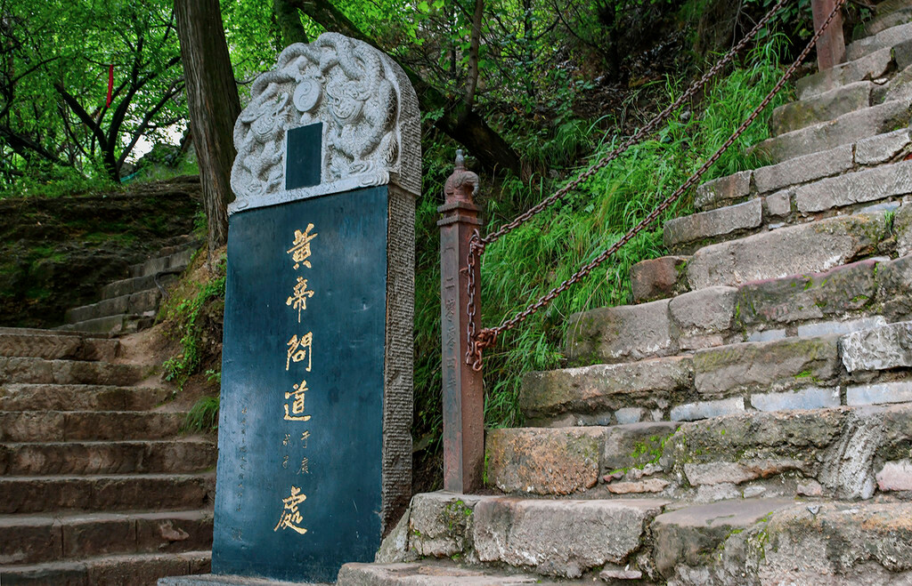 在天梯的半途,峭壁上巨幅石刻:“黄帝问道处”扑入眼帘,虽历经风雨,好在隐约可辨。没想到我苦苦寻觅之处,却在这角落悄然散发着历史的沉香。驻足,无语,敬仰。 4700年前的《神仙传》记载说,轩辕黄帝战败蚩尤,解除了北方的强大威胁之后,将主要精力用于治国爱民。闻广成子在崆峒山隐居,便不顾路途遥远,风尘仆仆前来请教治国之道。