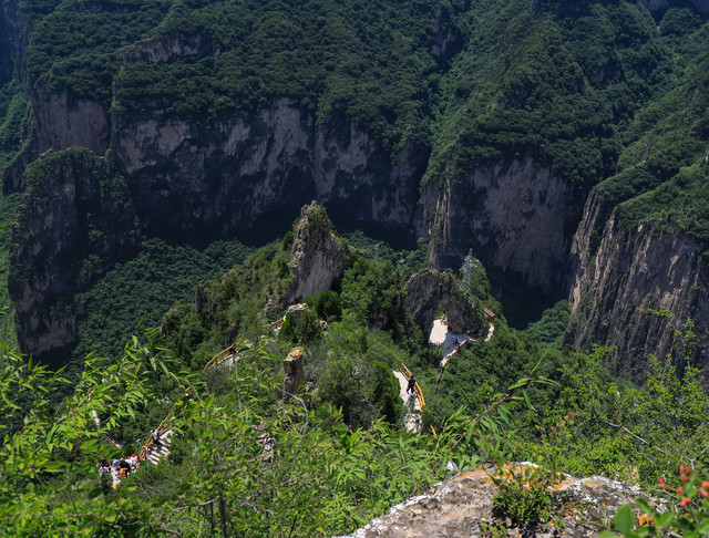 红豆峡也是太行大峡谷中的必玩之地,峡谷因有大面积天然红豆杉而得名。红豆峡的地貌和八泉峡略有不同,顺着铁质的天梯可以爬到山顶,山顶有一条穿山隧道,像是原来山民自己挖的,没有任何支撑物,有点阴冷还有点小紧张。山顶有间小寺庙,也有山村居民。对外有民宿,感觉没有住在山下峡谷中凉快。