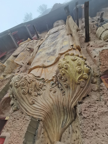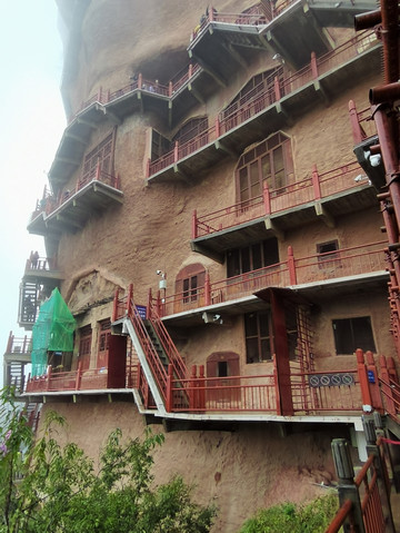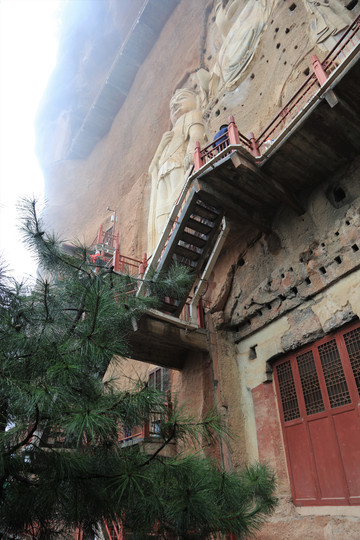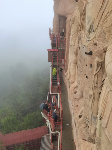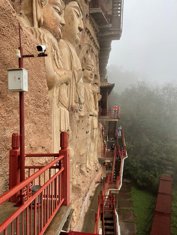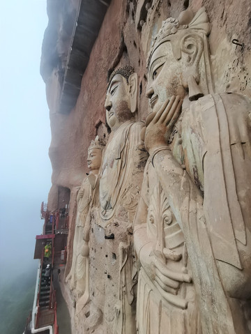 初来乍到,盘山路再加阴雨天,辨不出方向,后来知道,现在看到的是麦积山第13窟,俗称“东崖大佛”,位于东崖中部。开凿于隋代,南宋绍兴年间重修。系摩崖浅龛,立面近方形,高17米、宽约18米。摩崖高浮雕石胎泥塑一佛二菩萨像,正中主尊为阿弥陀佛,高15.7米。