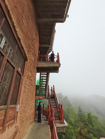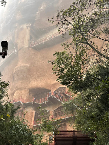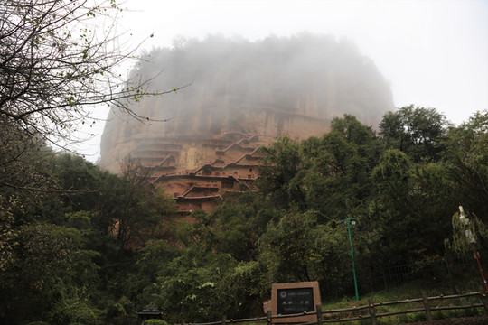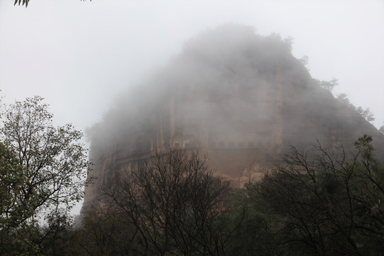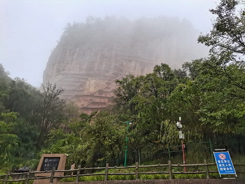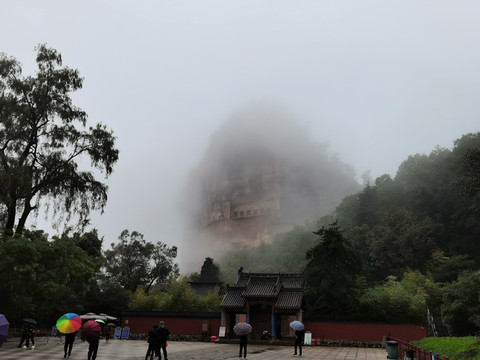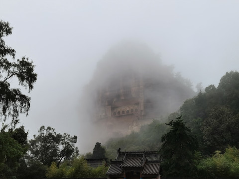山岚缭绕、烟雨蒙蒙,麦积奇峰时隐时现。