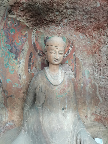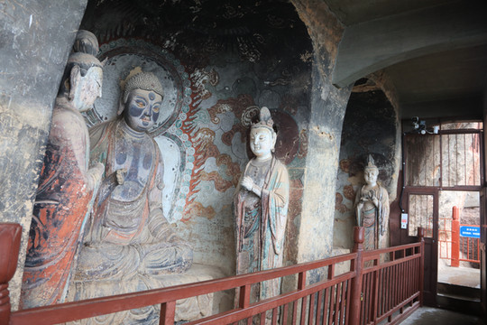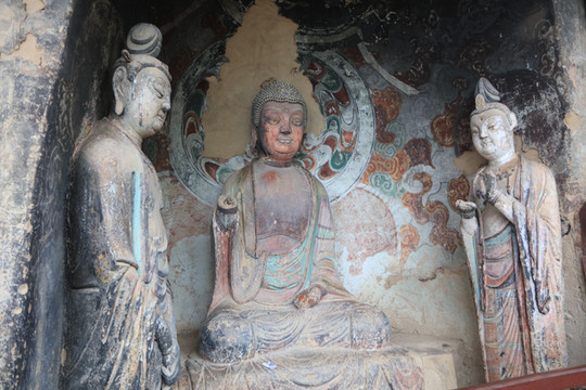 127窟,正壁龛中为石雕的一佛二菩萨,佛着褒衣博带式袈裟,面带微笑,清俊飘逸,右手作无畏印,左手作与愿印;127窟是麦积山石窟壁画最丰富的洞窟,窟内各壁及其窟顶分别绘制了西方净土经变、维摩经变、涅槃经变、地狱变、睒子本生、十善十恶、帝释天出行、七佛等佛经内容,这些经变故事画都是国内最早、最大的经变故事画,而敦煌同类的经变画最早是出现于隋代,晚于麦积山石窟近百年的时间。