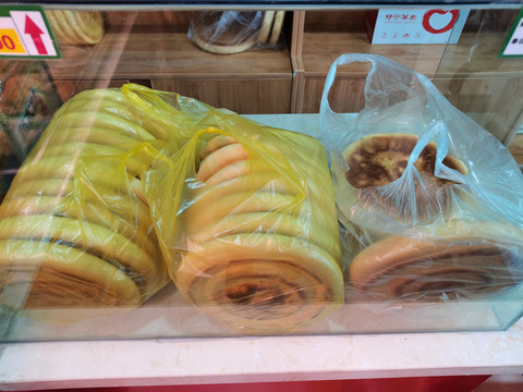 服务区超市闲逛,看见这烤饼(锅盔),想起了几个月前在新疆每天都吃的烤馕,忆起在新疆旅行的时光。