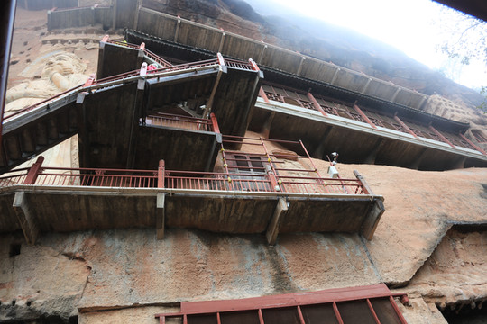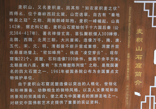 麦积山石窟始创于十六国后秦(公元384-417年),著名高僧玄高、昊弘聚积僧人300禅修。北魏、西魏、北周三期,大兴崖阁,造像万千;隋、唐、五代、宋、元、明、清都曾不断开凿或重修。洞窟开凿在悬崖绝壁上,“密如蜂房”,栈道“凌空穿云”。现存窟龛221阁,泥塑、石刻造像7000余件,壁画千余平方米,北朝崖阁八座,素有”“东方雕塑陈列馆”之称。麦积山石窟泥塑像以突出的人格化、世俗化和形神兼备、动静相生的独特风格、以及人文景观和自然景观的完美结合,成为中国的旅游圣地之一。