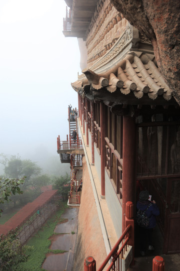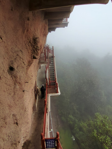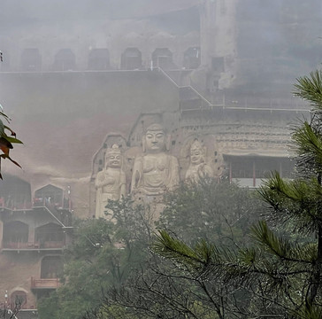 “麦积烟雨”,为秦州八景之首,每当夏秋之季阴雨霏霏或雨后初晴,山岚缭绕、烟雨蒙蒙,麦积奇峰时隐时现,呈现出“麦积烟雨”之景观。此种醉人美景虽然难得一见,却让我们赶上了,可见运气不错。烟雨笼罩,横云飞渡,犹如进入海市蜃楼般的幻景。