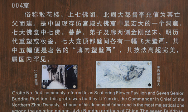 长廊墙上有景区石窟介绍,翻拍几张最为精美之造像。也幸亏有此存照,因为参观过后方知,并非所有的地方都对外开放,有的窟还需单独购买特窟参观票,票价不菲。