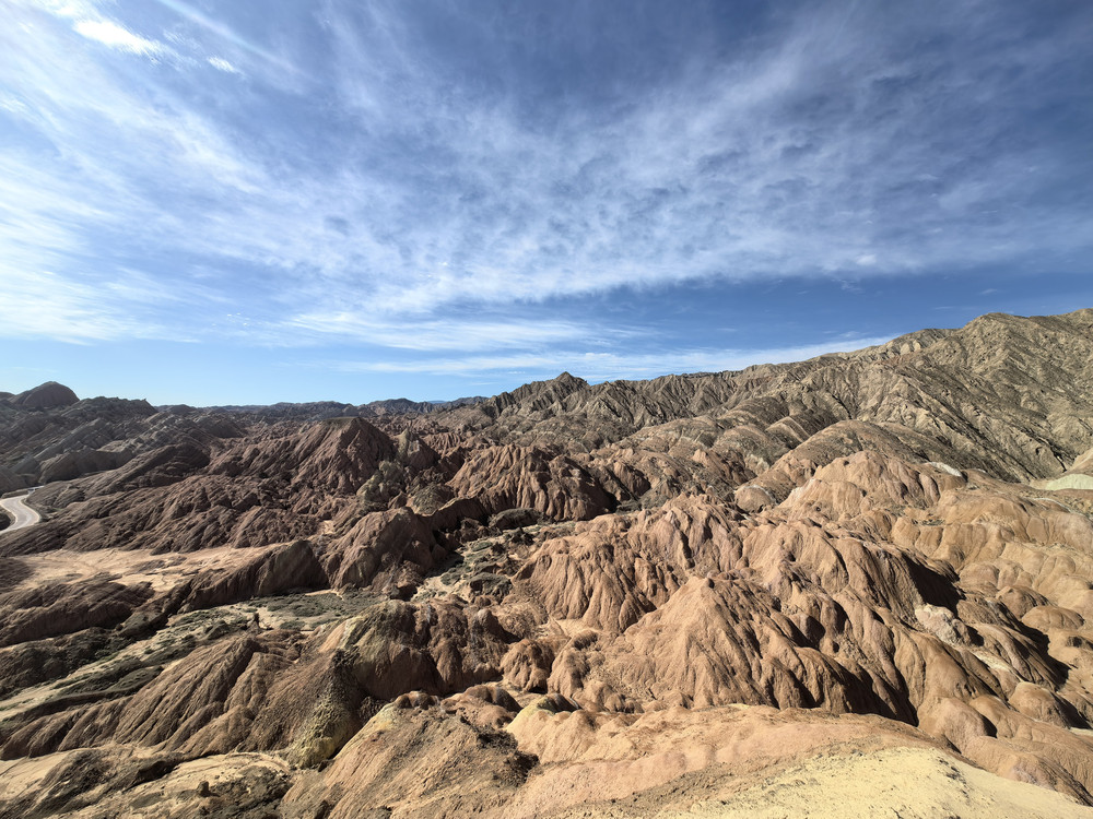 走在路上,发现一个奇怪现象:阳光明媚,但总时不时看到片阴影,而周边全无建筑或者山头,那“影”是什么形成的呢?老婆说是“云”。再往前走是黑独山,就在路边,拐下去一公里,停车,爬上一个小山坡看,景色还是很有特色,很是壮观的!无人管理,没有修的路,沿着前面车轧出来的路走即可,沙漠地带,不要轻易下路,地质软硬你并不清楚。