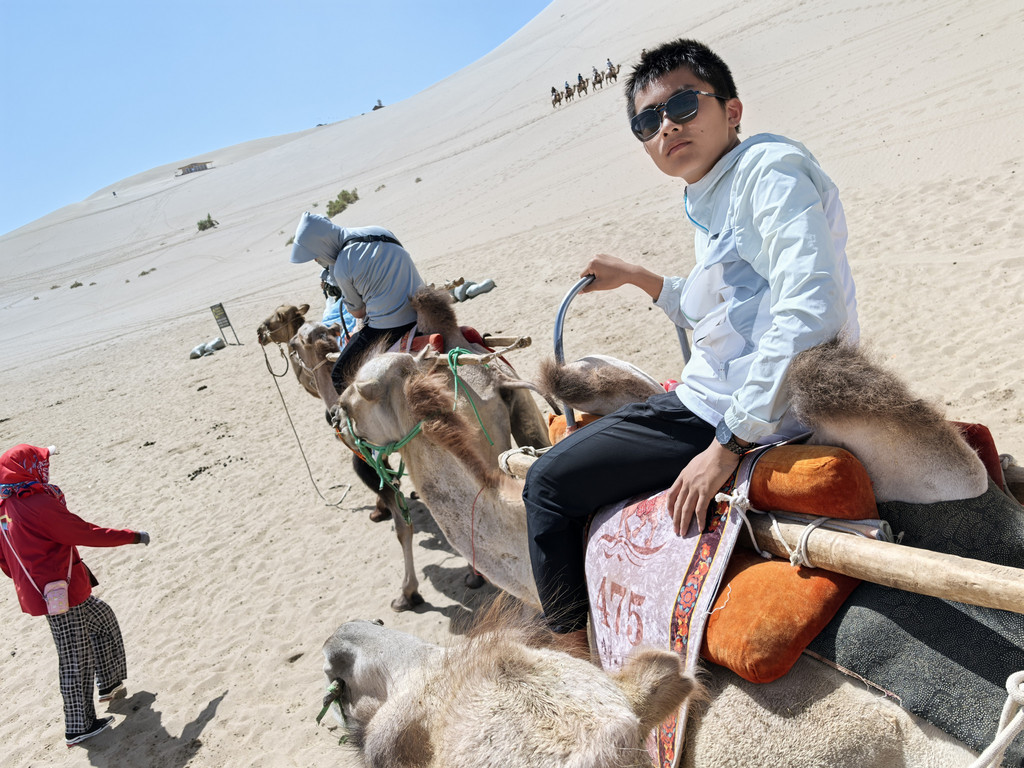DAY 12:7月22号,今天的行程规划是上午参观莫高窟,然后途经玉门关,阳关,夜宿阿克塞,全程223公里,高德预计3小时27分,无高速。莫高窟九点开门,我们早早吃过饭,打算九点赶到。拐上去景区的路,发现已经有车往回走了,心里纳闷:他们这么快就看完了?我查的攻略是,正常票在此旺季是需要提前一个月订的,258元,含八个窟,数字电影和交通,由专家负责讲解,为满足游客需求,每天发售一万两千张应急票,100元,含四个窟和交通,由普通讲解员负责讲解。应急票只能在游客中心购买当天的或在市内某个代售点可提前三天购买,不能在线购买,我也在携程上查了,没找到购买应急票的入口。由于自驾游,走走停停,甚至出发日期都无法确定,所以一开始我就是奔着应急票来的。可当我们九点一刻赶到时,应急票已售罄,只能买到三天后的25号了!(这里说明一下,是我们攻略有误,应该微信小程序打开“莫高窟参观预约网”提前预约,应急票也可以提前约)。没办法,我们只好离开莫高窟驱车再奔鸣沙山东门,儿子心念念的骑骆驼昨天因为时间不够而没有骑成,现在可有时间了,我们决定发挥门票余热,再赴月牙泉!老婆鼓励道:咱们回家看《敦煌》纪录片,莫高窟趁淡季再飞过来看!