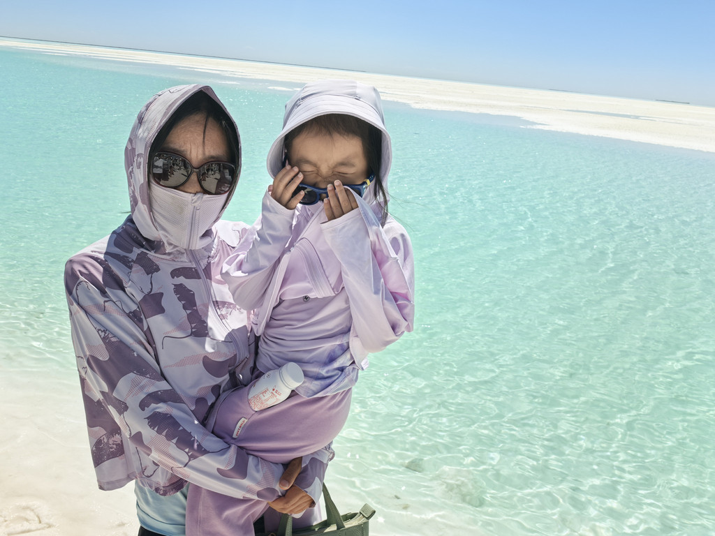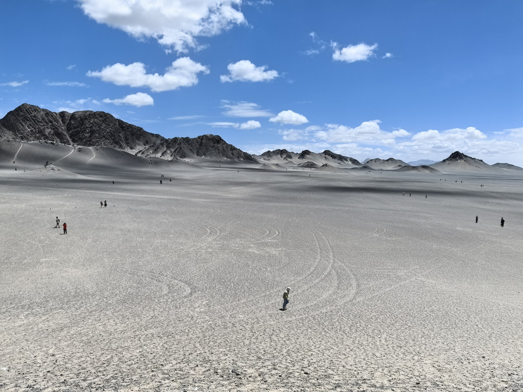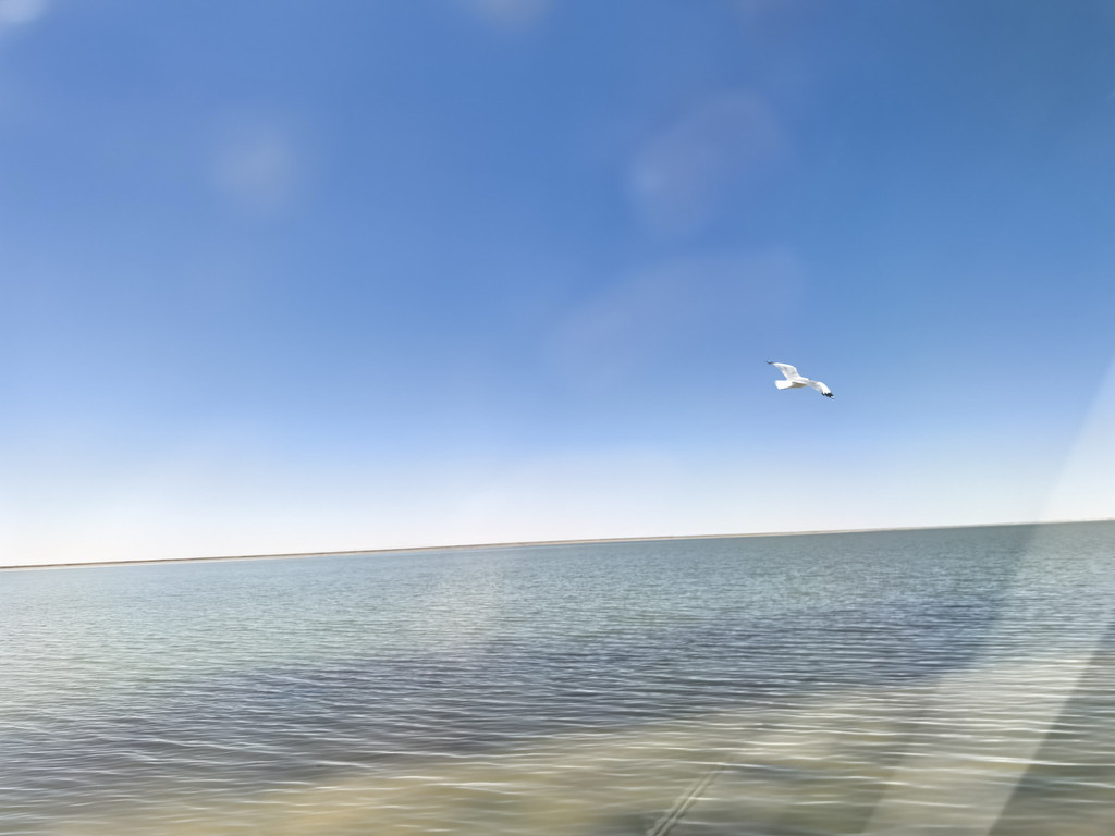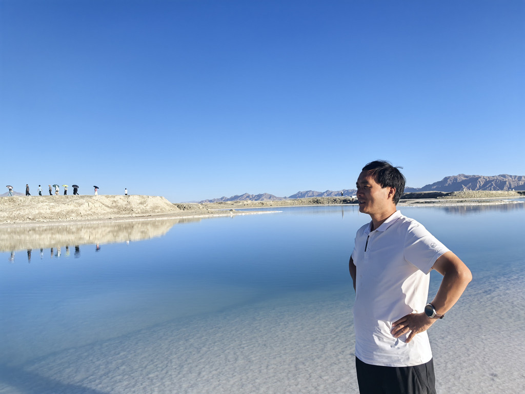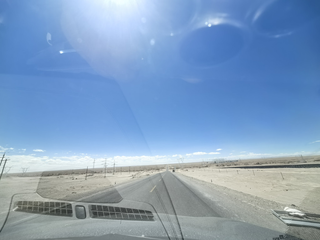 昨天,今天,明天的路程,虽然有几个景点,但整体上是一望无际的荒漠或者雅丹地貌,荒无人烟,吃喝用品可以备车上,但上厕所是个问题:路窄,不能路边停车;荒漠,不敢轻易下路;每百十公里有临停点,有旱厕,奇臭无比且人多须排队!我们总结出一个好方法:见有拐下去的小路(多为去厂矿区的)或明显汽车轧实的硬地,驶下去,用车挡着,“野”一下,女士也只好这样了。有一次,我们“野”完,我想着在车外活动舒展一下,又驶下一台车,但里面的人却迟迟不下来,我赶紧上车,给老婆说:“咱们赶紧走吧,否则他们不好意思下来方便!”。当右侧的小柴旦湖映入眼帘后,西台吉乃尔湖也就不远了,两边湖水充盈,景色很美,还有飞鸟,只是路就一下子变成了土路,坑洼不平还湿滑,不过都开得很慢,便于看风景,路变宽了,也可以靠边停下看一会儿。其实今天从拐上315国道这一路都是雅丹地貌,水上雅丹中是那一点湖水淹了一部分,拐下去百十米就是景区门口,我们没有过去,就在路边空地停车,找了个高处看了看,因为湖水退去的原因,现在很小一片,买票进去也只是近距离看一下。再沿国道前行二三十公里就到了东台乃吉尔湖,现在不是景区,也是一个矿区,但打卡的人特别多,由于车多,硬生生轧实了很大一片地儿,需要步行约600米到湖边,有大片的白色盐滩,浅蓝,浅绿色的湖水,映衬着透亮透亮的蓝天白云,很漂亮,也非常出片儿!