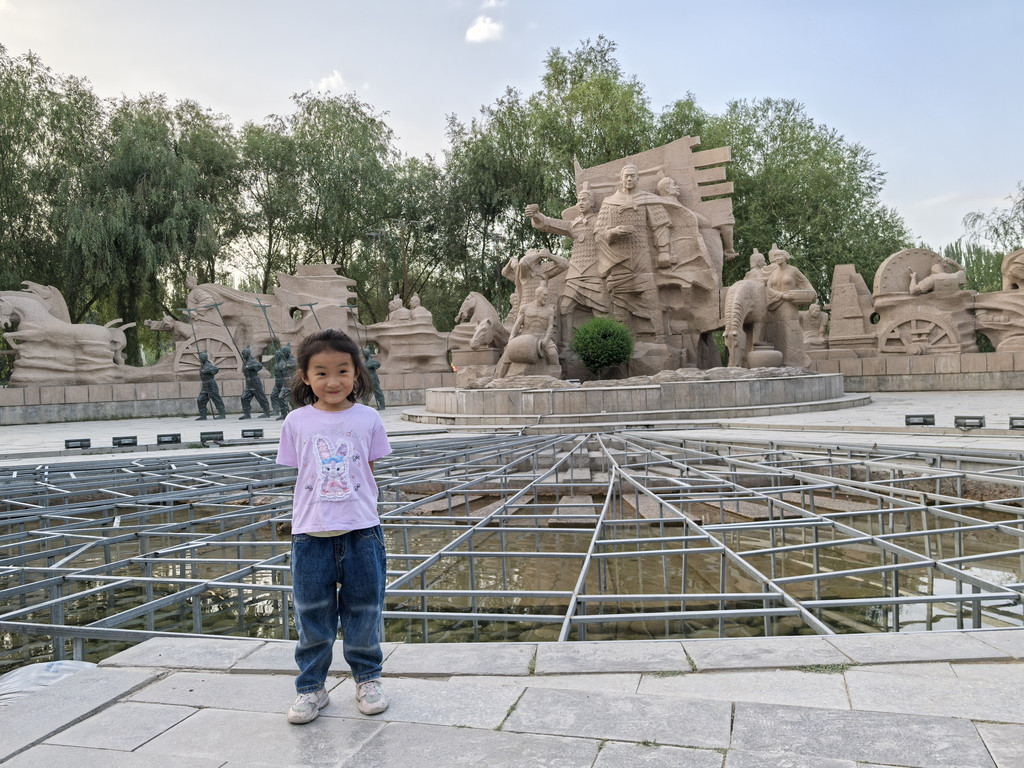 下午两点就到酒泉了,所订酒店就在万达广场旁边,直奔万达吃午饭。饭后老婆太累,就和女儿先在酒店休息,我带儿子去酒泉1969文化创意园,和山西阳泉的记忆1947文化园是一个性质,一个创意,就是废弃的大厂区,加点儿文化创意进行了些点缀,但做的远没有阳泉的好。去,主要是因为里面的一个航天科技体验中心,50元的门票,里面其实就是个微型科技馆,不值一提,但是买199元的票,可以开飞机,这个我认为是很值得的,那其实是个类似飞行员训练用的模拟飞行器,有教练坐在副驾上教。给儿子买了199元的票,我买的50元的票,进去后舱门是上锁的,我也可以进去坐在后面看,说是半个小时,不过由于我们后面也没人了,我们俩玩儿完又问了很多问题,教练也很友善,耐心解答,儿子玩得非常过瘾。据工作人员说这样的设备全国仅三台(当然不算专业飞行员用的),儿子儿时的英文作文就说梦想是当飞行员,这个体验他既紧张又兴奋,高兴坏了,也很难忘!出来后回酒店接上老婆女儿又去西汉酒泉胜迹景区,这是个公园,是左宗棠募资所建,面向公众开放,算得上中国第一个公园,里面有一泉眼,相传是霍去病倒御酒入泉池的地方,泉池前面是左公柳,后面是霍去病及士兵群雕,再后面是个湖,整个公园郁郁葱葱,傍晚散步休闲挺好。