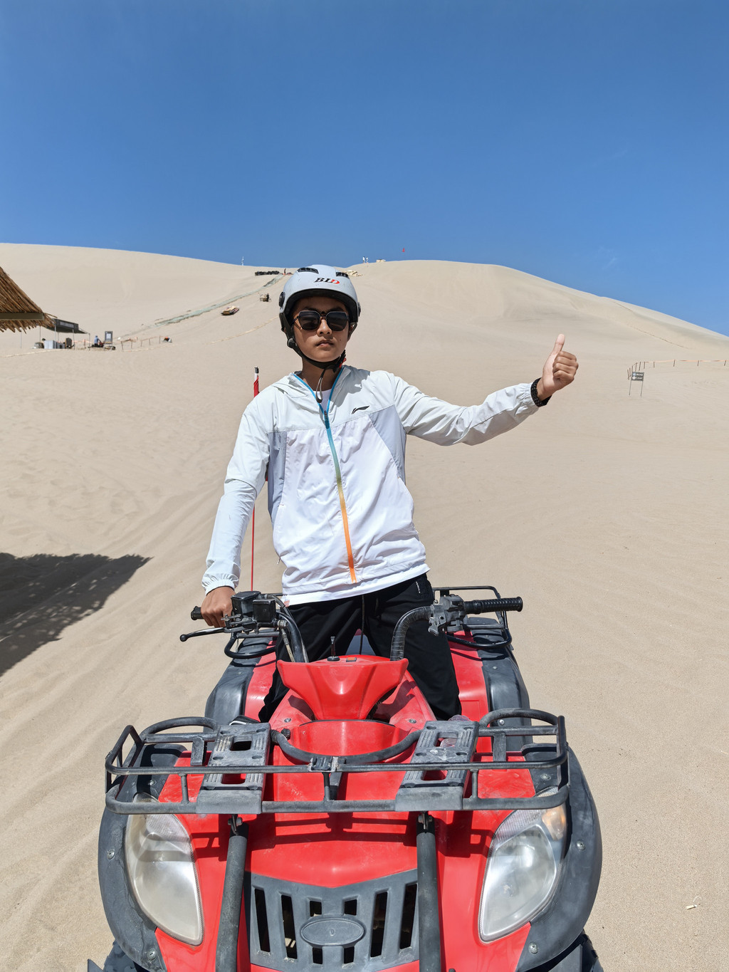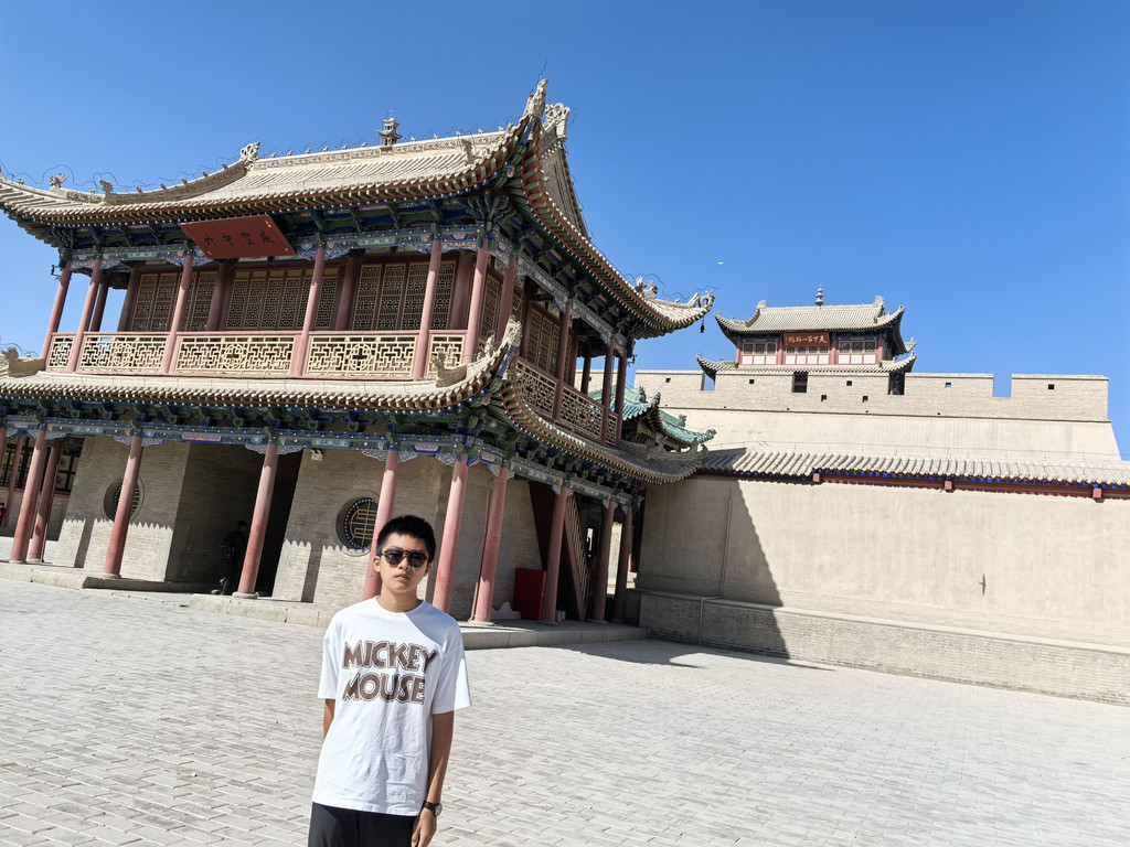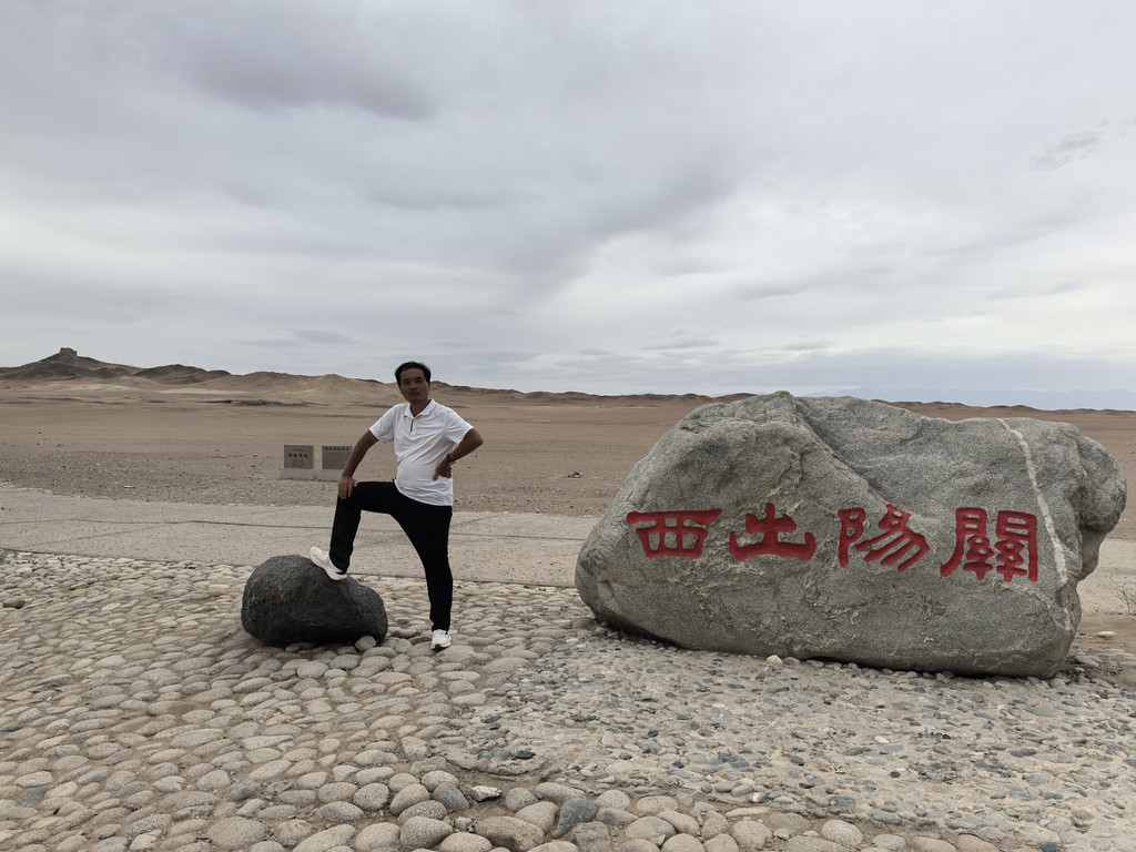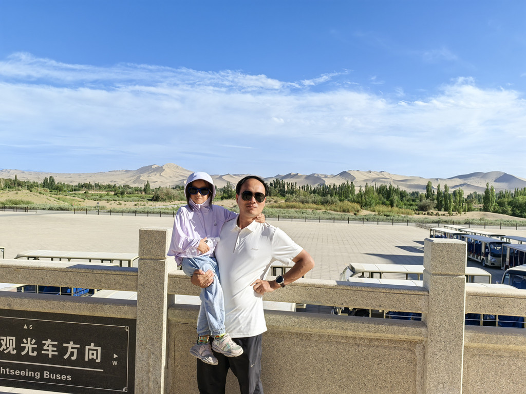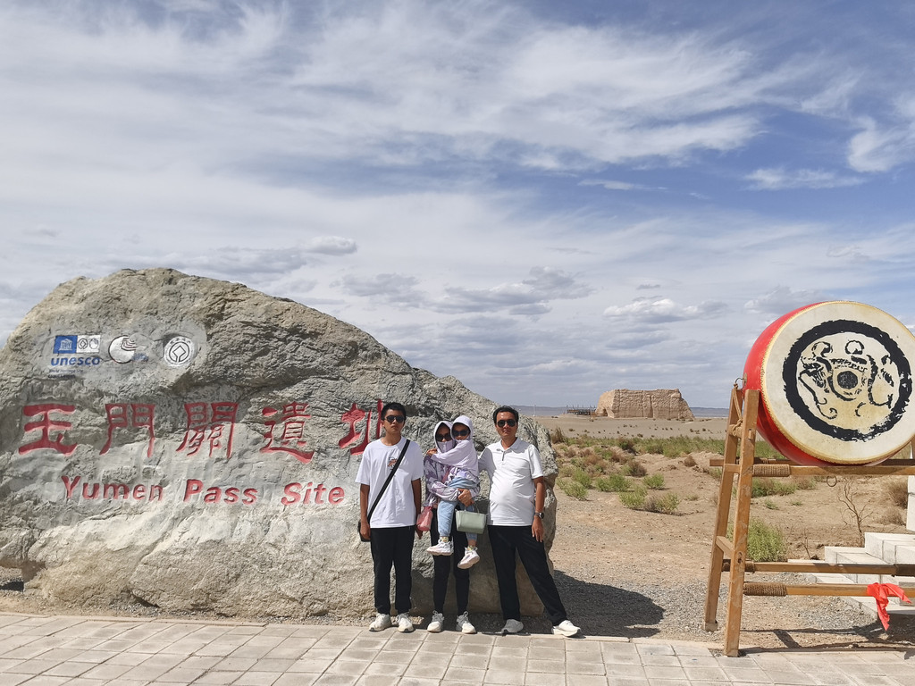 路上我们一家开玩笑:这次旅程有两大笑话,一是来了敦煌没看成莫高窟,二是住的最贵的酒店,却睡的时间最短。来到月牙泉,除了骑骆驼,还给儿子加了一项骑沙地摩托的体验!体验完了,想着吃过中午饭再出发,搜到了一个评分很高的天马街上的叫“清真尕古丽西域餐厅”,不料过去之后却发生了一个小插曲:我在等吃饭的间隙去旁边一个叫嘉德鹿的中型超市买了些水和零食,结账的时候,收银员是位面容慈祥,年近六十的大妈,“102块3,”她看我扫码付款后看着小票打印机没走,问:“你是要小票吗?”,我说“是呀!”,于是神奇的一幕发生了:她迅速扯出小票,手一捋将小票撕掉扔身后的垃圾桶里了,从旁边拿一大瓶康师傅绿茶,说道:“送你个这吧!”。明显这里面有猫腻,我迅速心算了一下,加上这瓶绿茶大约也就是这个钱,较真争执起来影响心情还耽误时间,就不划算了,那边老婆孩子还在等着我吃饭呢。幸好饭吃得很好,高高兴兴再了出发!突然想起了李连杰版张无忌在电影中说的:面相老实的人也不可信!前往玉门关,阳关的路全是荒漠,阳光明媚,总感觉前方公路上有水,左前方的远处有湖,实际上什么也没有,不知道这算不算海市蜃楼。去玉门关要单独折返七十公里,但架不住王之涣的“黄河远上白云间,一片孤城万仞山。羌笛何须怨杨柳,春风不度玉门关。”太出名了呀!玉门关票价四十,进门便是小方盘城,是遗址,站在城旁,环顾四周,感受大漠边关的荒凉与戌边的艰辛!又惊喜发现不远处的绿洲小湖,不由得感慨古人建关选址的高明!景区内还有两个景点(汉长城和大方盘城遗址)需要加50元乘每小时一班的摆渡车,往返三十七公里,我们没有再去。下一站:阳关。王维的“劝君更尽一杯酒,西出阳关无故人。”大家耳熟能详,而我们今天的路线也的的确确要“西出阳关”了,必须好好思念,留念!阳关门票五十,摆渡车二十,修有关城,里面有古烽燧遗址,还有许多攻城道具之类的,也确实是《神探狄仁杰》等电视剧的取景地。在此,我给儿子办了“通关文谍”,盖了好几个印章,还经过守关兵士的盘查,好好体验了一把“出关”!