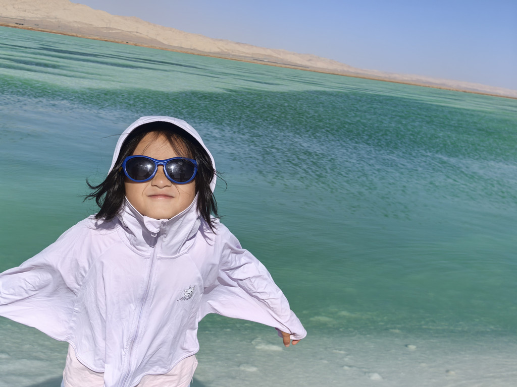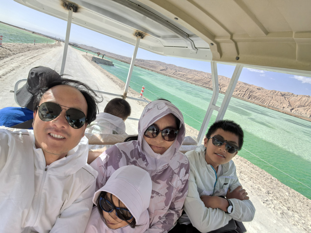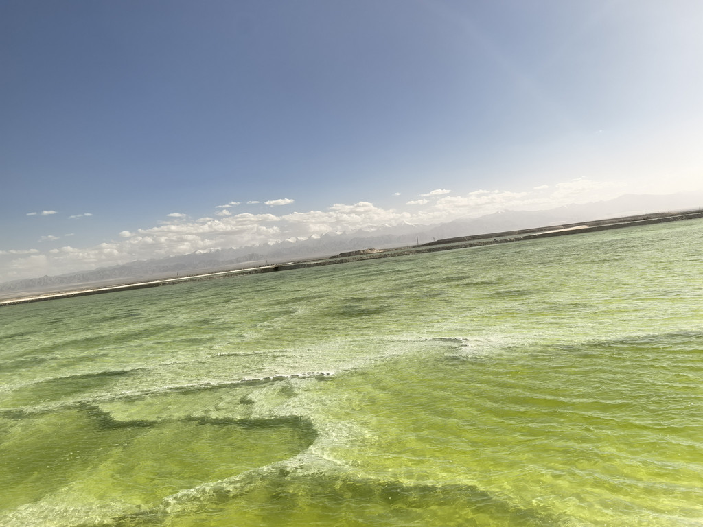 途经冷湖镇,先过检查站,全车人下车,验身份证,通过安全门。这里也是个石油小镇,有宾馆,饭馆,在这里吃了碗拉面,量小价高还超难吃。晚上订的是茫崖金哲大酒店,吃饭时接到酒店电话,说是他们区域停电检修,预计晚上十点来电,建议我退订。我又在携程上重新订了茫崖另一家酒店的家庭房,比金哲贵了105元,大约半小时后又接到了携程客服的电话,因为酒店原因给我带来不便表示抱歉,他们要给我补偿差价,并取了个吉利数字,给我补了108元。携程的这个服务倒是出乎我意料的,给她点赞!从老茫崖收费站上高速,行驶七十公里,翡翠湖下高速,这里现在还不是景区,只是个矿区,下高速即到矿区大门口,登记一下,不收费,进门后是土路,未修,开车三公里到停车点,就看到芒崖翡翠湖了,不收门票,但需要购买30元的电瓶车费,乘电瓶车进入,有三个站点,里面很大,每个湖都很大。坐上电瓶车才发现,这里是“盐路”,大路小路全是盐垫起来铺的,湖底也是盐,白色的,水很清,浅处蓝色,深处翠绿色,蓝少绿多,可见湖水还是很深的。坐着电瓶车,行驶在颠簸的盐路,近赏翡翠湖靓色,远看昆仑山雪景,听着司机侃侃而谈,凉风习习,心旷神怡!