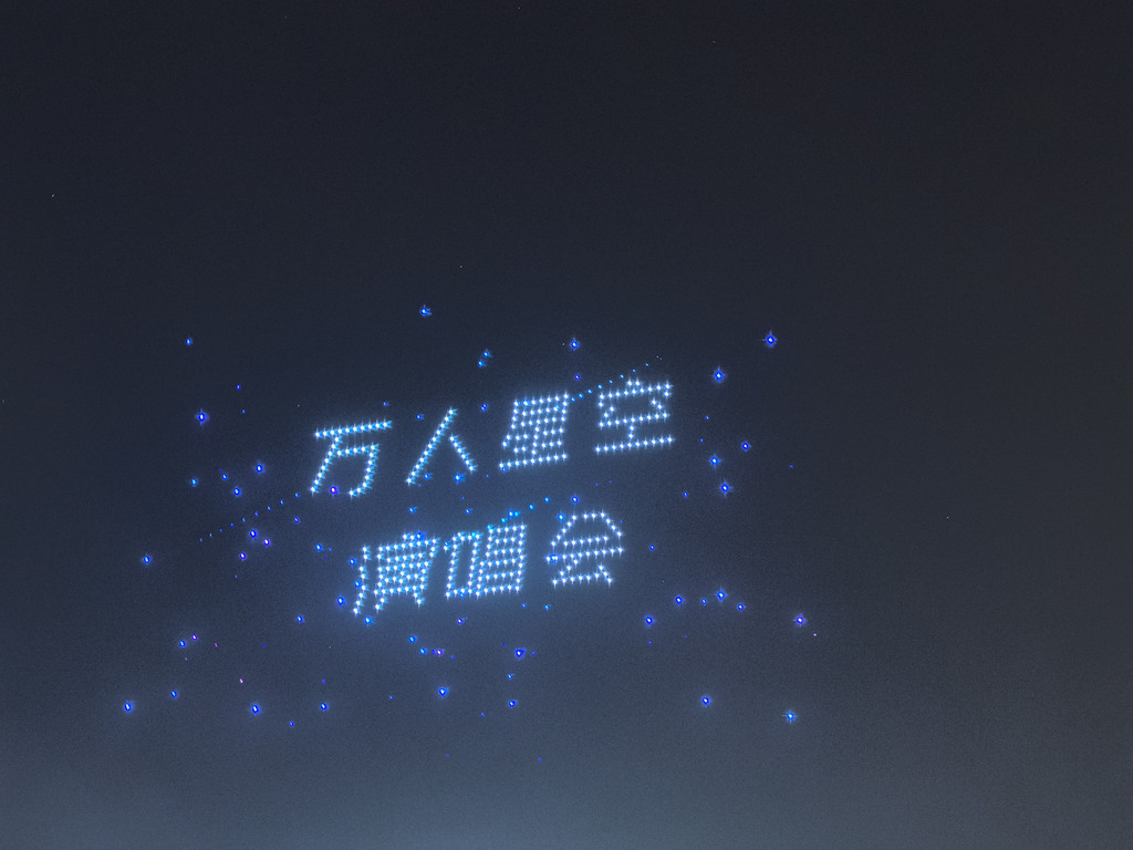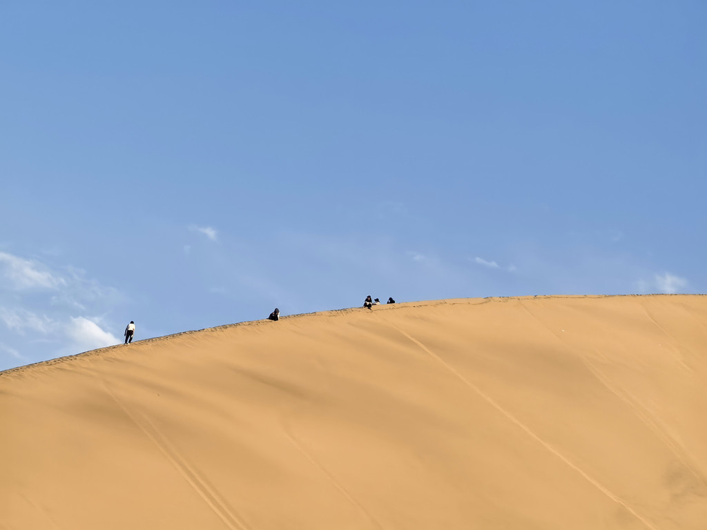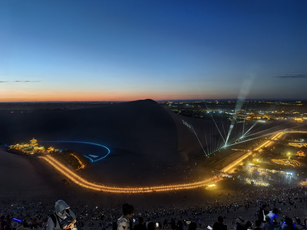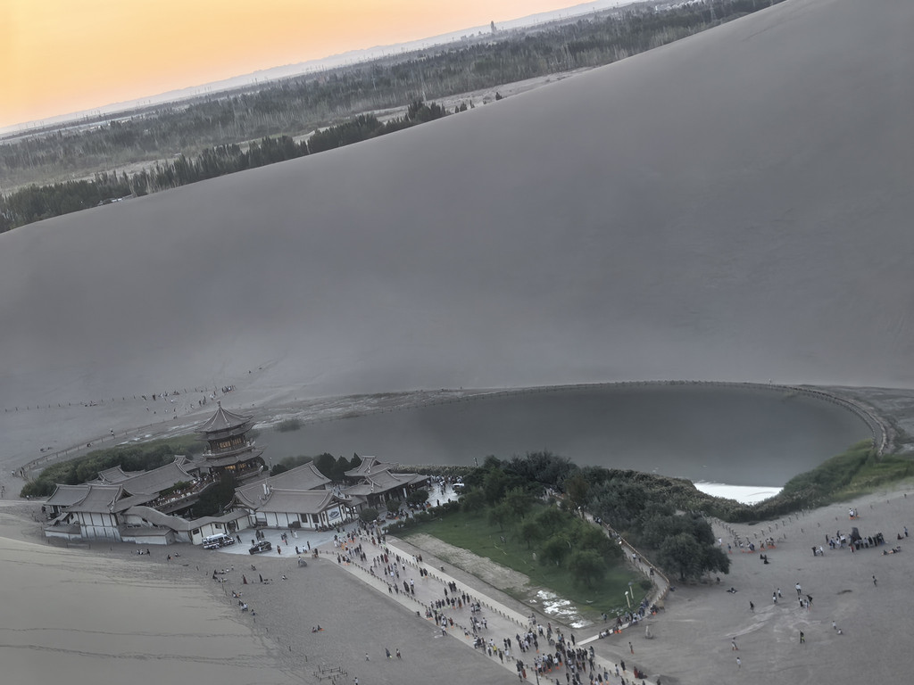 月牙泉和旁边的楼阁,搭配周边的沙丘,真的很美,泉水不断,沙丘不改,风吹沙响,千年不变,很是神奇!虽有很窄的木制阶梯栈道,但我和儿子都想体验沙漠行走,于是决定爬上旁边的大沙坡,由于是傍晚,赤脚踩沙,走一步下滑半步,甚是费劲儿,我中途歇了无数次才勉强爬上,瘫坐在地。爬上去景色真的不错,很多人各种摆拍,宣传片中的月牙泉大抵也是从这个角度拍的。中卫的沙是黄色的,很细,而这里的沙很粗,较黑,玩儿起来另有一种味道。我爬上去的时候,儿子已经等我了有一会儿了,我看着后面最高的沙丘说:“你看那个沙丘,真高,肯定没人爬了吧?你看,你看,还真有人爬呀,佩服!”说完,还随手向那个方向敬了个礼。没想到儿子说:“我也要爬上去!”,说完就过去了。我劝他不要去,天快黑了,现在的位置就是九点四十看“万人星空演唱会”的最佳位置,他头也不回地说到时候赶回来,让我在原地等他。我震惊之余,既为儿子高兴,又为他担心,只能心里默默的为他加油!懊悔没有给他我的手机,一是方便联系,二是也方便他拍照!没办法只能坐下来用手机相机拉近焦距看着他,幸好爬的人少,看得虽然模糊,但也认得出他。快到山顶时就看不到他了,后来他借了别人手机联系到我们,说到了最高处,让我买好水等他。是呀,开始爬的时候他手里的水只剩半瓶了,我这个粗心老爸!九点半的时候,天已昏黄,他下山的身影出现在我的视线里,我赶忙拿上刚买好的,还较凉的脉动饮料冲过去接他!他告诉我说,他在山顶上看日落了,很漂亮,上面很多人,女的多,大多都在摆拍发视频,不过女的几乎都是坐山地摩托绕到背面上去的。回到原地,演唱会的音乐刚好响起!演唱会在下面,月牙泉的旁边,有部分游客买票在舞台周围看,绝大部分人都在这个大沙坡上,台上,台下,山上互动,伴着音乐和天空的无人机表演,热闹非凡!