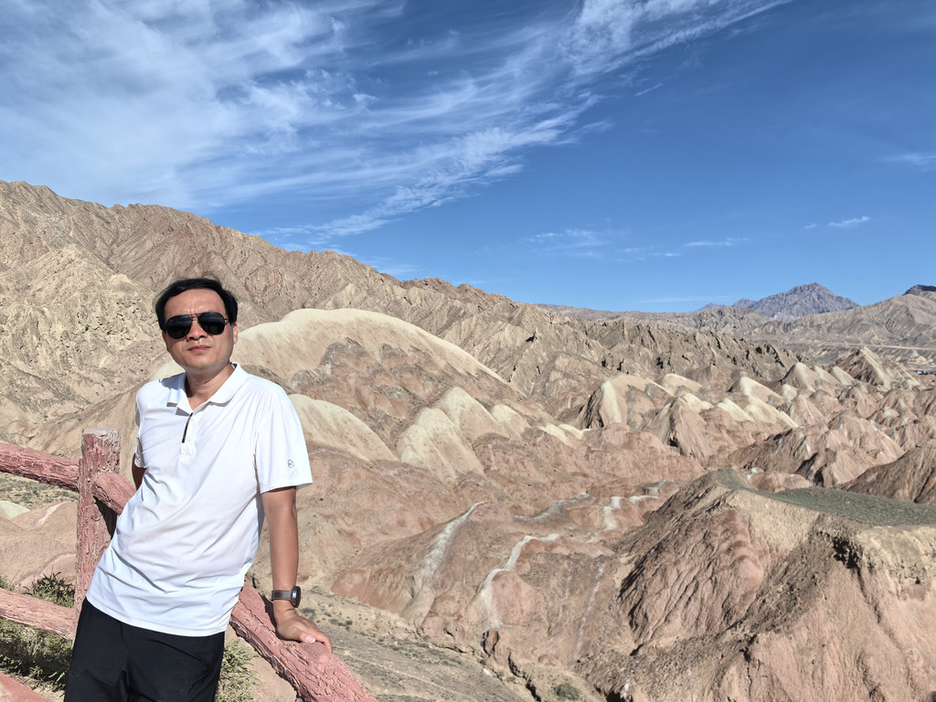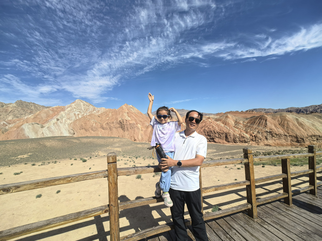 风景迤逦,美不胜收!游完卓尔山,在祁连县城吃午饭,老婆要了份新疆炒粉,因为不能吃辣,就点了份微微辣(我第一次看到还有这个辣度),结果着实领教了新疆辣椒的厉害!不过老婆还是直夸这个辣椒的好,嘴里吃着辣,但喉咙里,胃里不烧,还满口留得!饭后直奔张掖的七彩丹霞,需要再度翻越祁连山。景色很好,但遇到了大雨,还见到了几片路上的小落石。其中一段路,过了一个3米长的烂路后发现路被拦了,才发现其他车都提前从一个小路口下去绕路了,但也堵着呢,应该是小路太窄,会车不易。正在犹豫之际,一辆大车也开了过来,路窄且刚过的那段烂路有坡,大车是无法后退或者调头的了,司机下来看了看,发现前面都是好路,就直接拧开铁丝,把拦杆打开了,我也跟着过去了,开了百十米,走到小路与大路的交汇处,被堵着的对面的司机问我能不能过,我说现在能,快点过吧。司机道谢后赶紧开车通过。之后,我们倍感幸运,这要真被堵到路上,还下着大雨,那可麻烦透了。快到七彩镇时,途经冰沟丹霞,查攻略说是新开的景点,与七彩丹霞胜在颜色相比,它胜在奇形,且人少,时间有限,就不去了。晚上七点到达七彩镇,大雨还在下。我们还打趣,是因为七彩镇才叫七彩丹霞呢还是因为七彩丹霞才叫的七彩镇呢?镇上景区附近是成片的别墅群,外观相近,都是吃饭住宿的地方。我订的是万象桃园假日宾馆,停车方便,服务态度好,晚饭前台推荐斜对面的新丰盛源,查了一下,评分热度排前二的,进去一看,火爆异常,服务员明确告知需要等四十分钟,点菜时也明确告知分量大,要少点,最后一个菜上的慢了点儿,前后来了两个服务员来道歉并各送了两瓶饮料,给商家点赞!但单就味道而言,实在不可恭维,毕竟是镇上的饭馆,每年也就再三个月的旺季,不可能养着个大厨的。