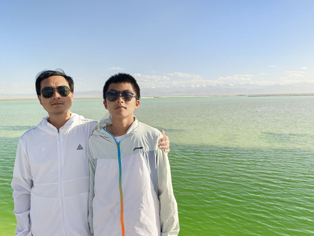 下午五六点到达大柴旦翡翠湖,停车场很大,几乎停满,有进有出,门票50元,摆渡车(小火车)60元,总共四站,到最远处来回八公里。这个景点名气非常大,是《送你一朵小红花》最后易祥千玺那个镜头的取景地,从公告上看,今年三月份才开始收费,但进去实在大失所望,明显可以看出湖水干涸退去的痕迹,所谓的“湖”都成了小水洼,两个大点儿的也就游泳馆那么大,且水不深,很少呈翠绿,不过由于青海给力的蓝天,白云,角度选好,拍照还是很出片的,很多人在此换装,摆拍,但我们却是无感,毕竟有茫崖翡翠湖给我们的震撼在前。到两个大湖处也就两公里,我和儿子没有坐车,走到中间放了很长时间的无人机。