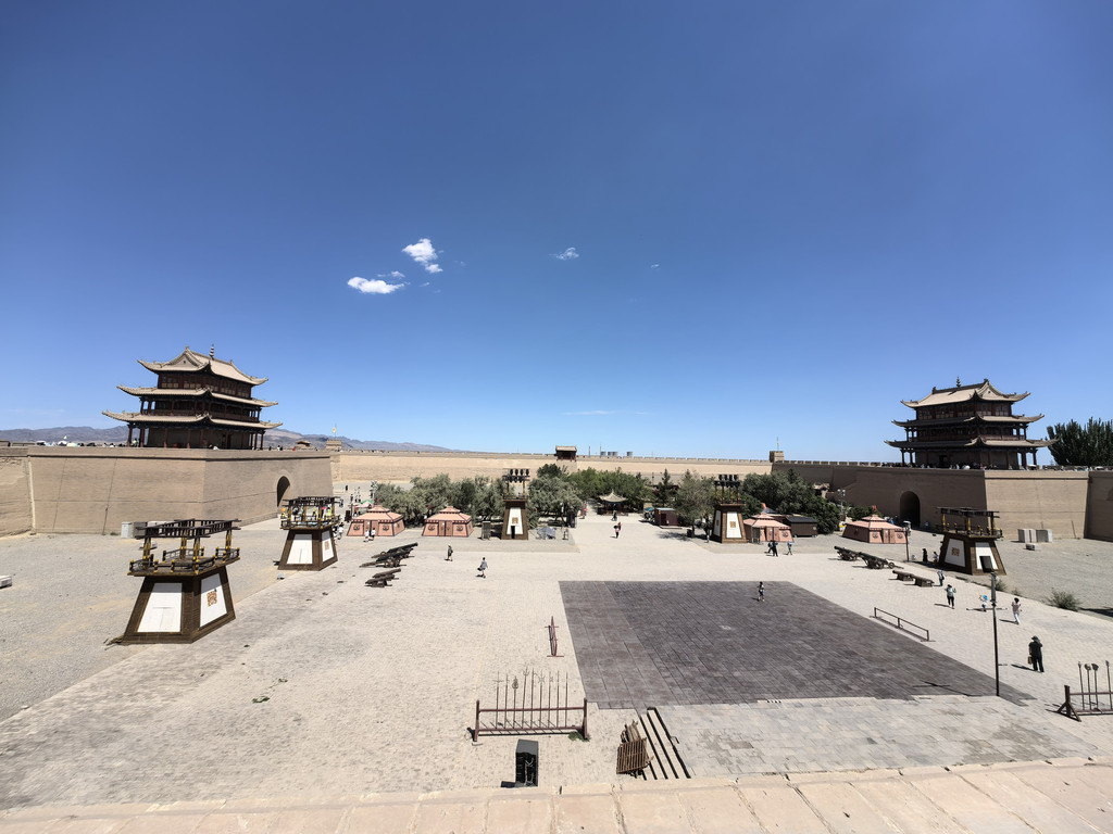DAY 10:7月20号,从张掖出发,途经黑水国遗址,骆驼城遗址到酒泉,共285公里,高德预计3小时。酒泉古称肃州,甘肃的肃,所以现在城区称为肃州区,本来直接开到嘉峪关,夜宿敦煌也是可以的,这样可以节省一天,实在是因为酒泉是汉武大帝所置四郡之一,又是著名的航天城(发射中心离酒泉尚有二百多公里,在内蒙古境内了,还会途经胡杨林,以后再去吧),所以就停留一下,再来了轻松游吧。黑水国遗址离张掖很近,但查攻略,荒废得很,难找,路不好走,就只选择了骆驼城遗址。全程高速,中间从梧桐泉下高速去骆驼城遗址。从高速公路上就有指引,很好找,路也好,有门,但是敞开的,无人看守,不能进车,遗址是文物,不让踩踏,修有栈道,为方便看其全貌,还修有两个观景高楼儿。遗址就是一圈土墙,高近三米,宽约两米,俯瞰时可以想象当年的繁华与恢宏,有南北两城,我们只看了南城,没再往北边走。游人很少,只有十人左右,我们还特意走进古城里面(只是空旷的沙地),抬头望天,环顾四周,冥想古时沙漠行走,至此歇脚,补给的心情与景象。儿子放飞无人机,录像拍照更气势磅礴。今天周六,儿子11点又该上网课了,就安排他在观景高楼儿的顶层上的课,清静得很,他还顺便给外教老师展示了骆驼城遗址。