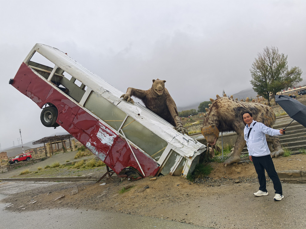 出小镇沿国道翻越当金山,景好,路好,车多,过垭口下行时有段6公里长的近乎直线行驶的下坡,不陡,但长时间的直线下坡行驶,还是应当多注意的,安全第一!进入青海,有个检查站,要停车,司机带证下去查验,开单后放行。外面一交警负责拦车,指挥车辆停放,年轻,高大威武,说话简洁,声音洪亮、严厉。我和一起排队的老司机们聊天:“看那个交警,真霸气!”“就得这样,昨天前面还发生个车祸,两个小车撞了,一个车内四人全没了!总有司机不在意安全,尤其是川A的,见缝儿就想塞!”,进板房开完单,交警轻声给我说了句话,由于方言,没听懂,礼貌地问:“什么?”“路上注意安全!”,他大声严厉地说!“哦,谢谢!”,我高兴地离开了。看得出来,他太忙太累了!过检查站十几公里就看到了昨日的车祸地点,公路上的痕迹明显可见,尚有很多汽车残留。从检查站到青海湖这一路,有好几个车祸警示,简单粗暴:把汽车残骸放在公路边的高台上!这一路,坡多,弯多,路窄,U型路多,大车多,景色单一易视觉疲劳,高原缺氧,到这里还多为长