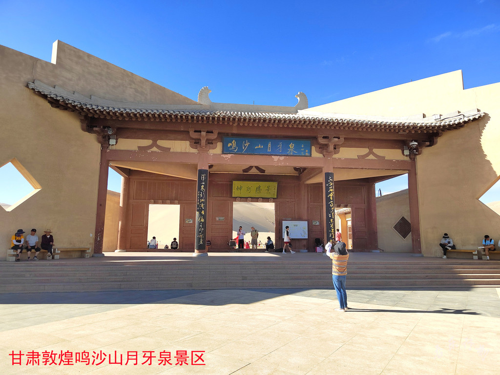 敦煌鸣沙山月牙泉景区有中门、东门、西门3个入口, 由6大景区组成, 主要景点有第一泉石碑、夫妻柳、月牙泉、鸣沙山、药王庙遗址等。