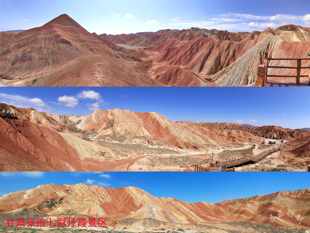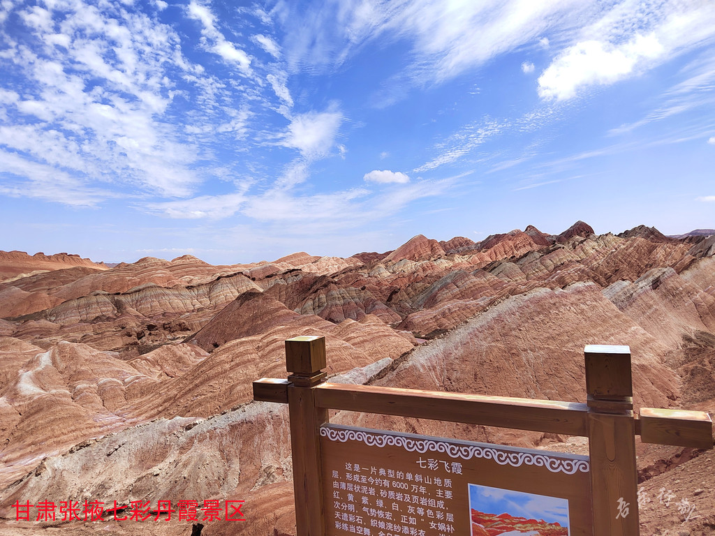 张掖市七彩丹霞景区景观地貌由形成于距今1.35忆年至6500万年前的白垩纪“红层”,在湖相沉积、构造运动、流水与风力的侵蚀等内外力的作用下,形成了中国独具特色丘陵地貌。