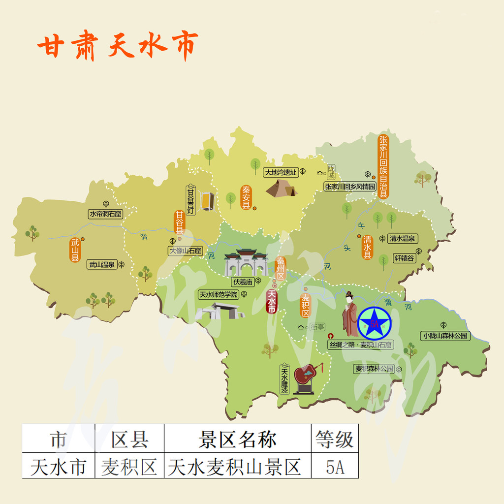 天水市麦积山景区拥有麦积山、仙人崖、石门、曲溪、街亭五个特色景区,共180多处景点。麦积山石窟始建于五世纪初,保存了221座洞窟,10632身泥塑石雕,1000多平方米壁画,题材丰富。麦积山石窟以泥塑、石胎泥塑为主要艺术形式而闻名,是中国唯一保存北朝造像体系最为完整的石窟,同时还是唯一保存有中国北朝崖阁式建筑实例的石窟,被誉为“东方雕塑艺术陈列馆”,是中国“四大石窟”之一,入列世界文化遗产名录。