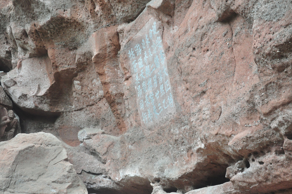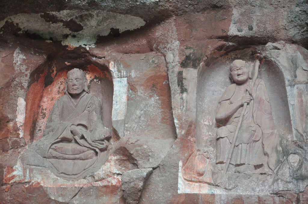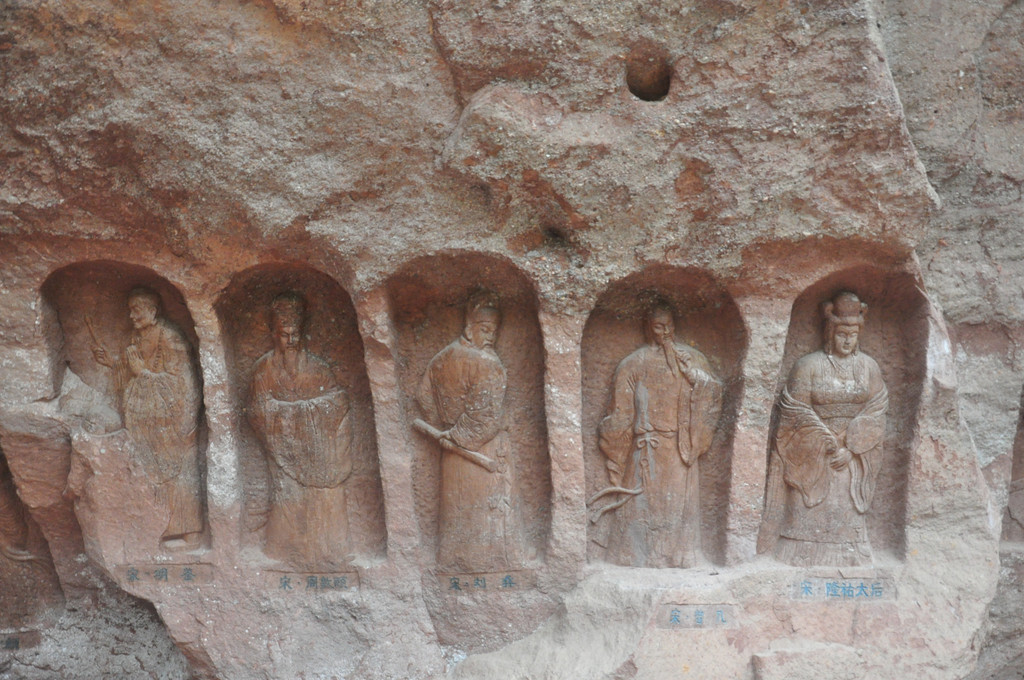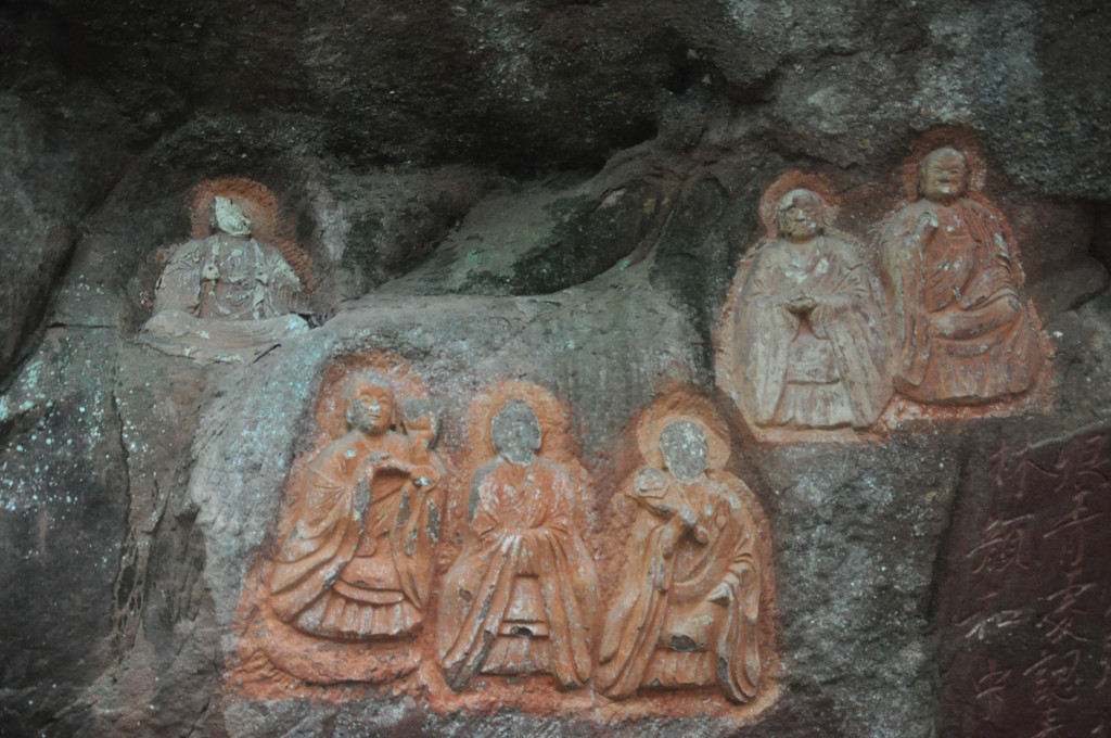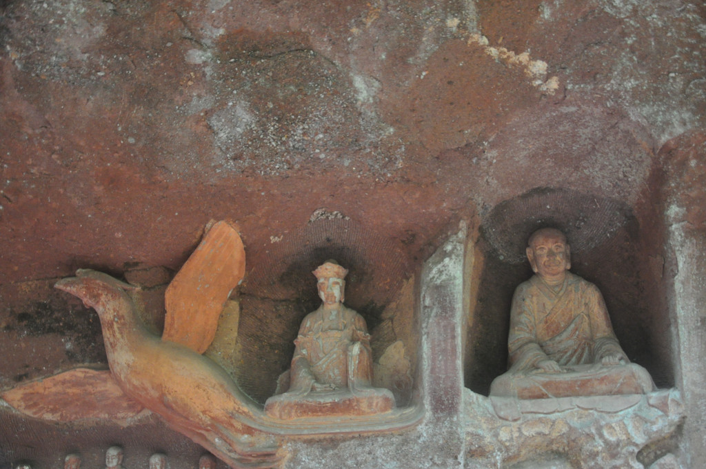 在悬崖峭壁中,有一组石龛造像,佛主毗卢遮那(即大日如来)作禅定状,左边是骑狮的文殊菩萨,右边是骑象的普贤菩萨,他们面相方圆,神态庄严。由这组造像向两侧延伸的悬崖上刻有层层排列的浮雕五百罗汉像,体态自然,表情各异,形成拱卫格局,气势恢宏,是北宋中期的作品。这里,集中了佛国世界的精华,是佛教信徒们顶礼膜拜的场所。
