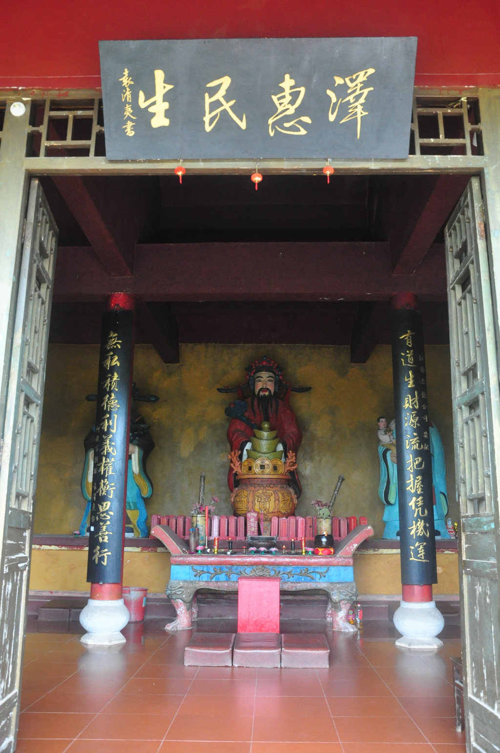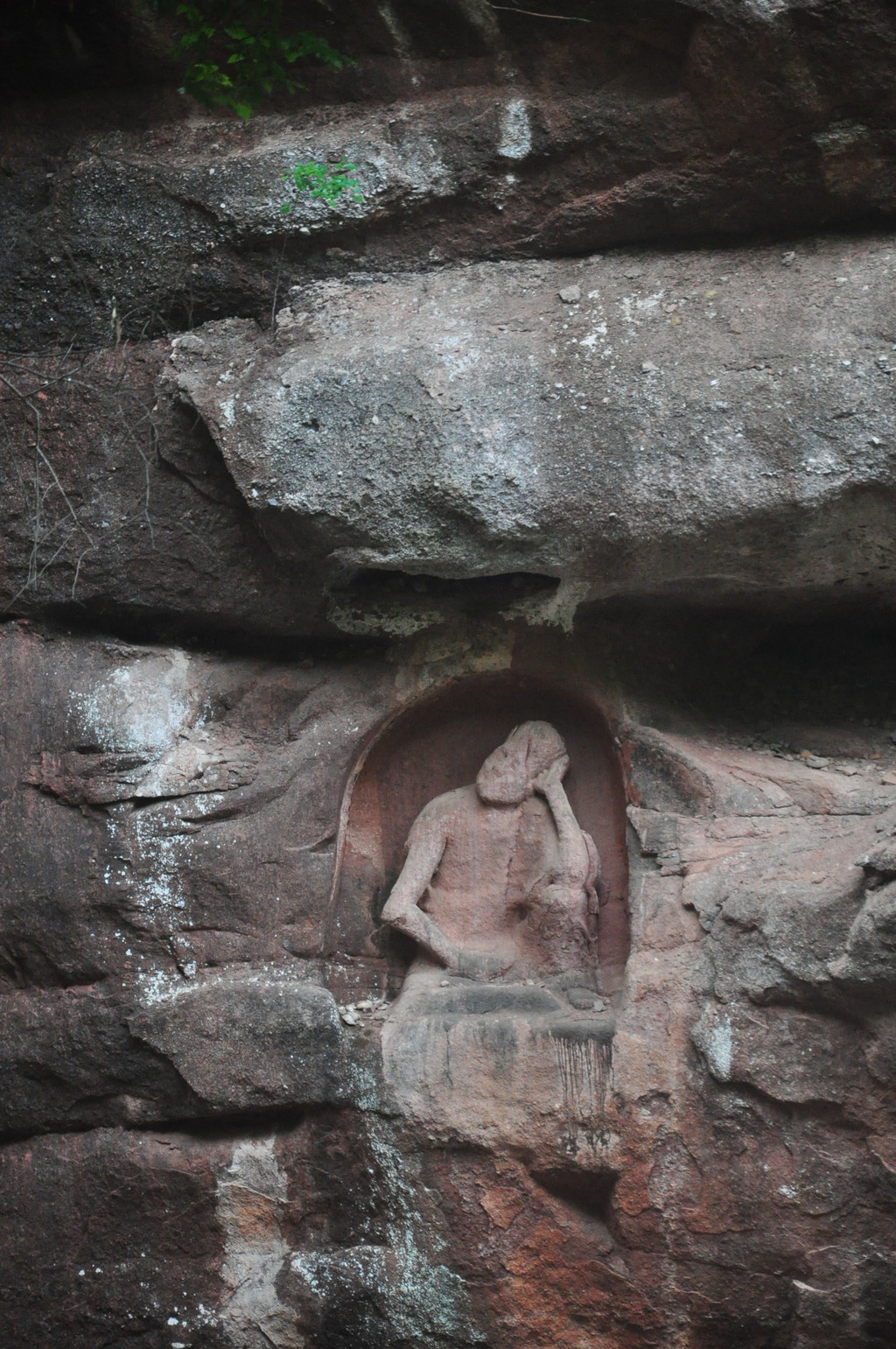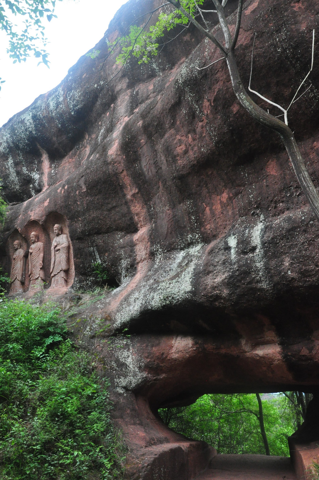 在悬崖峭壁中,有一组石龛造像,佛主毗卢遮那(即大日如来)作禅定状,左边是骑狮的文殊菩萨,右边是骑象的普贤菩萨,他们面相方圆,神态庄严。由这组造像向两侧延伸的悬崖上刻有层层排列的浮雕五百罗汉像,体态自然,表情各异,形成拱卫格局,气势恢宏,是北宋中期的作品。这里,集中了佛国世界的精华,是佛教信徒们顶礼膜拜的场所。