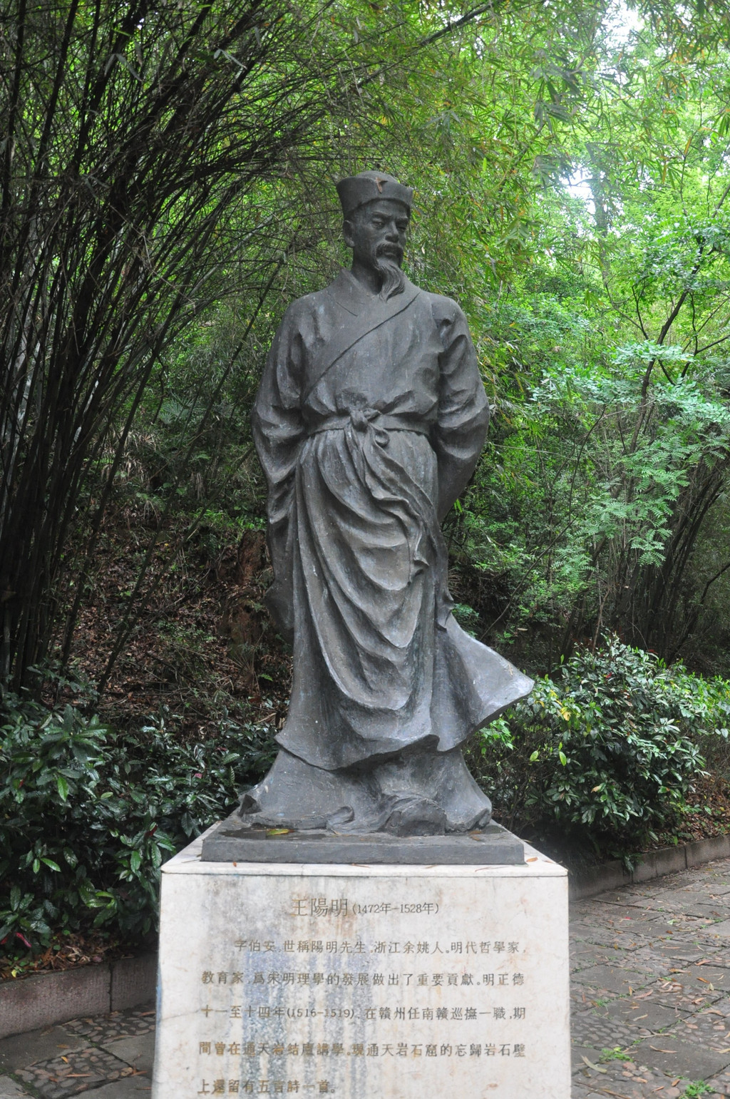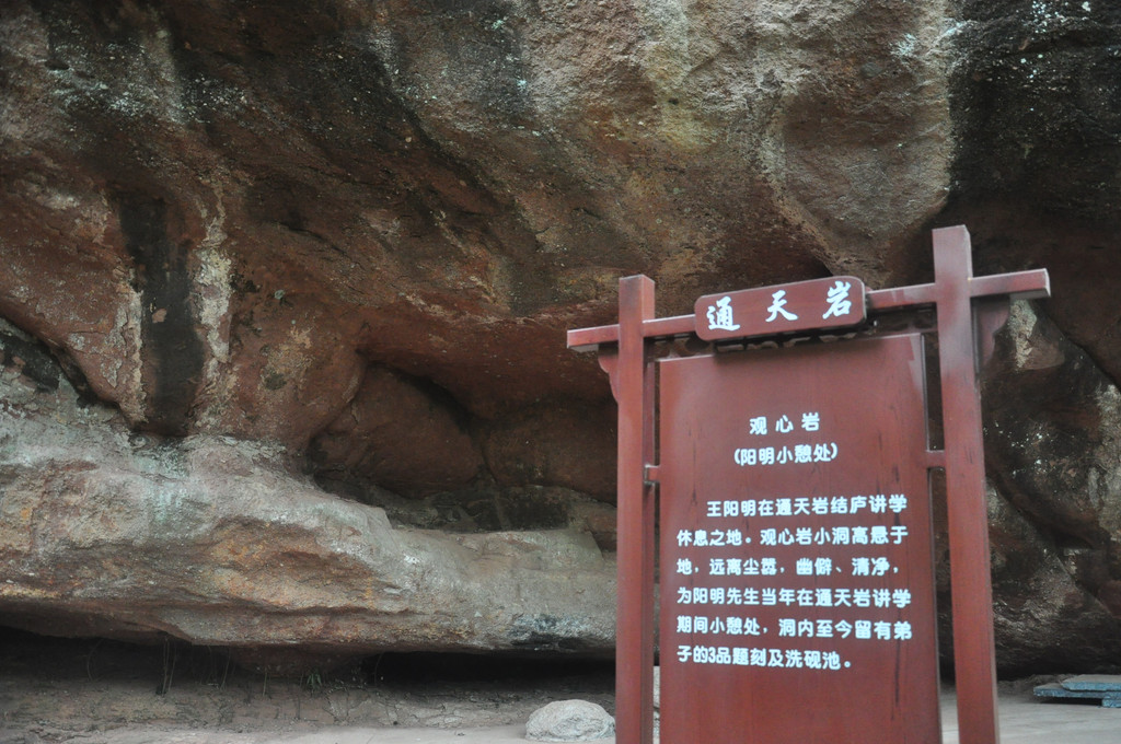 通天岩的第一胜景忘归岩,巨石横空,状若雄狮,极为壮观。有一个3米高、5米宽、10米长的扇形石洞。炎夏登临,洞内清风徐来,暑意顿消,令人流连忘返,故言"忘归"。明朝正德年间,南赣巡抚王阳明曾到此一游,即兴题诗曰:"青山随地佳,岂必故园好?但得此身闲,尘寰亦蓬岛。西林日初暮,明日何来早。醉卧石床凉,洞云秋士扫。"王诗及后人步韵题刻.至今仍保留在石洞周围的岩壁上。忘归岩顶峰建有一座望江亭,亭高3层,形似北京天坛祈年殿。