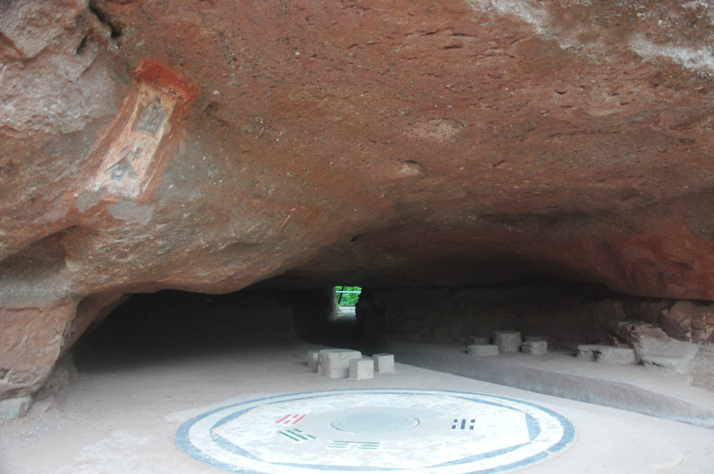 龙虎岩是一处丹霞洞穴,因有金龙和双虎石雕而得名。这尊造像叫龙树王,他是大乘佛教中观学派的创始人,金龙和双虎是其护卫神。在他的左边刻着一条金龙,金龙的后身掩在石岩之中,前爪张开象在悠闲行走的样子。右边是两只白虎石雕,它们好象在龙树王身边玩耍嬉戏。整座雕像构成了一幅生动的《龙虎闲情嬉戏图》。