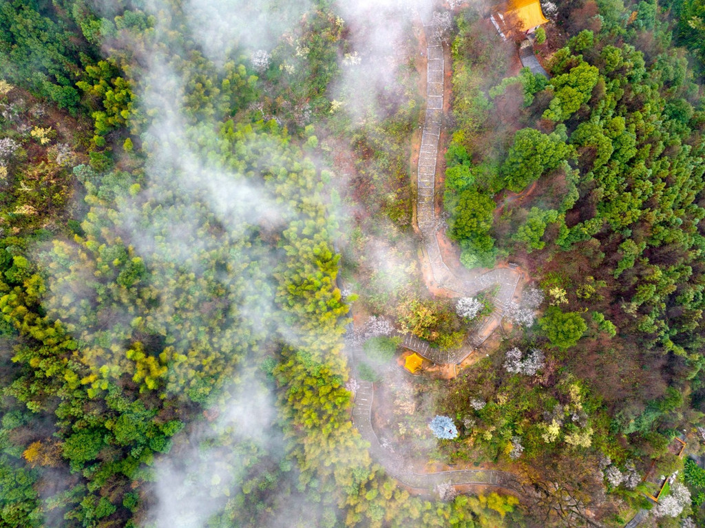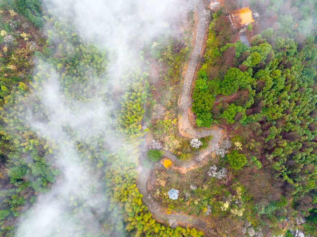还有一个视角去欣赏梅关古驿道便是航拍,云雾压的非常低,使得无人机升起来之后,感觉整个梅岭有一种仙气飘飘的感觉。