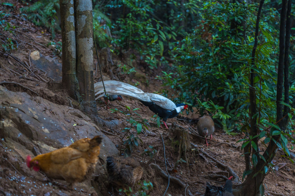 九成山舍同样住着一个“山人”,他是一位保安叔叔,我个人觉得他非常的不可思议。不仅仅是因为他也会演奏各种乐器,而且他能吸引了一大波国家二级保护动物“白鹇”前来,他拉起二胡似乎是可以和动物们说话一般。每一天,会有大量的白鹇前来觅食,似乎是边进食,边享受着保安叔叔的音乐。