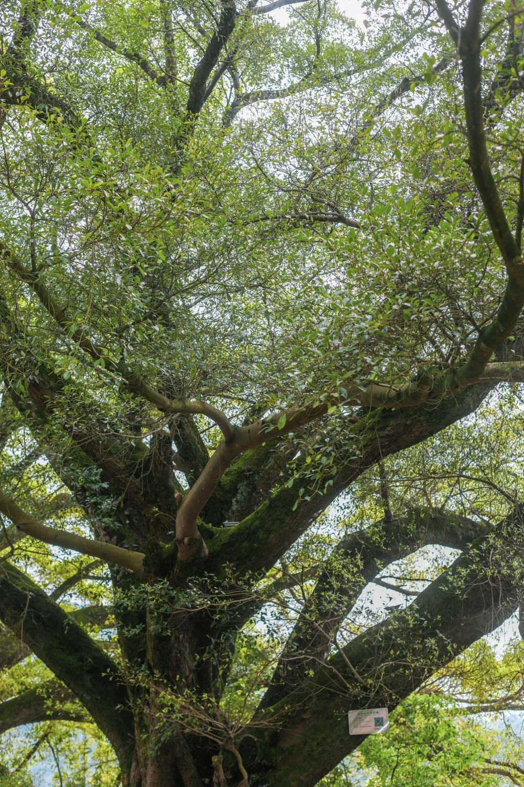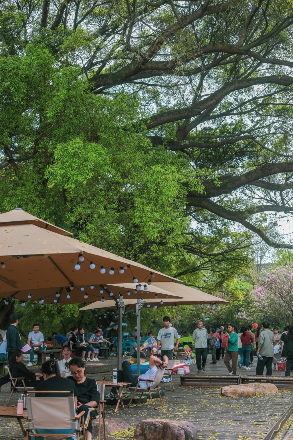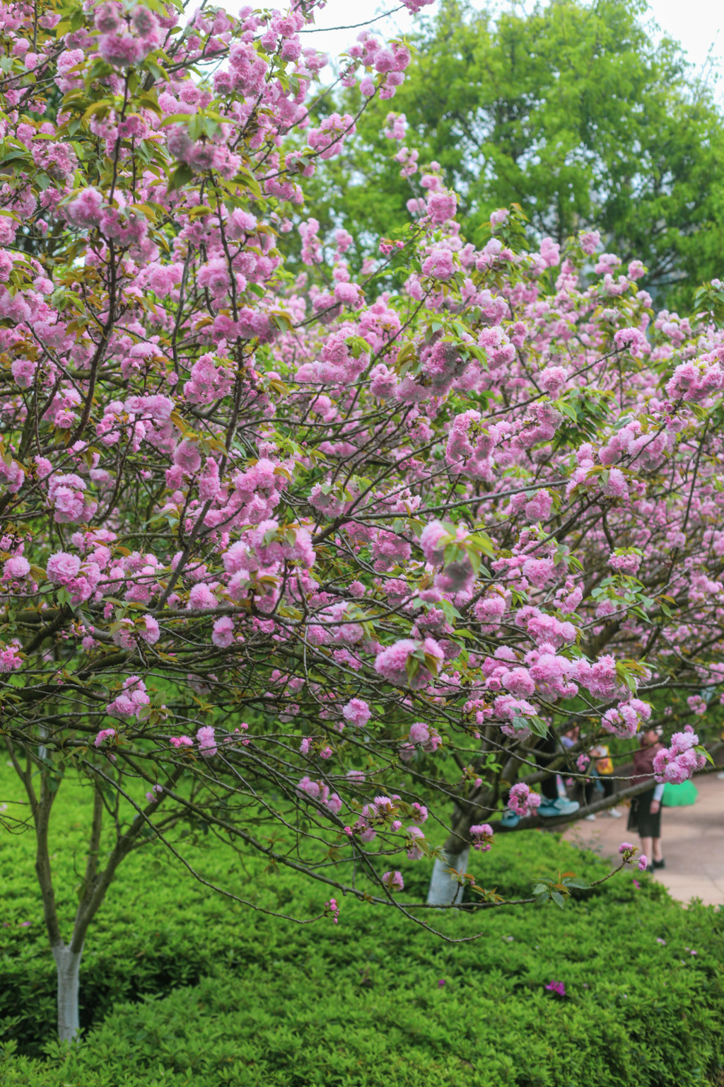 樱花和大榕树在一起生长,绿的榕树,粉的樱花,交错在一起,更显明媚而缤纷。
