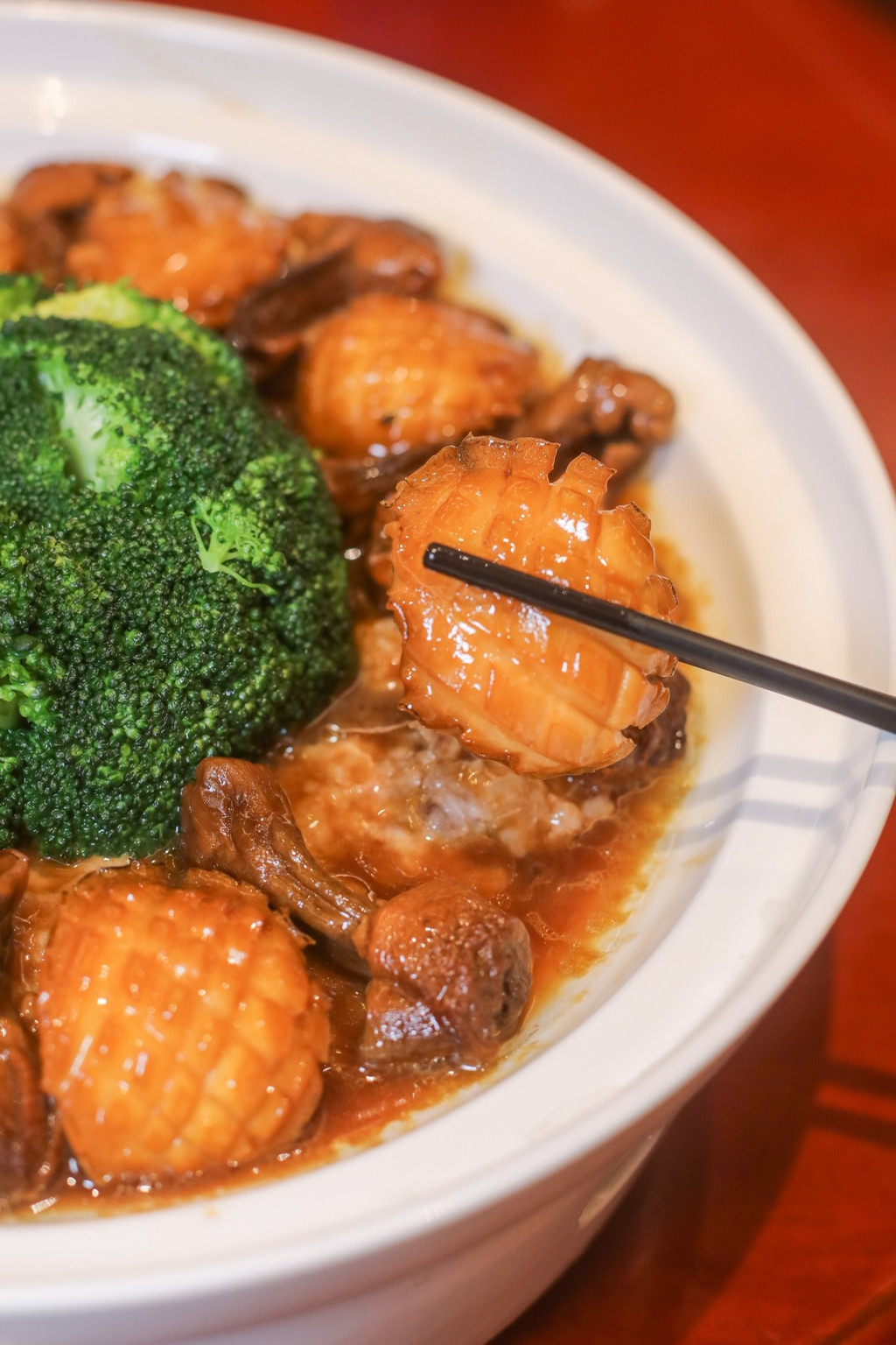 盘里垫入肉饼,肉饼还加入了客家梅菜,口感非常丰富。在肉饼上放入鲍鱼和松茸菌,鲍鱼爽口鲜甜,吸收了松茸菌和肉饼的鲜甜味道。非常特别。