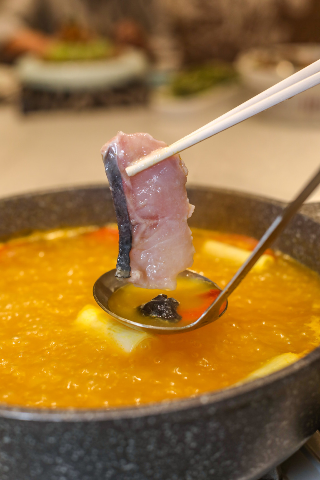 过桥鱼片选用了新鲜的鸭嘴鱼作为材料,切成厚度合适的鱼片,然后放在熬好的汤里烫熟,吸收了汤的鲜味,鱼片非常鲜嫩。
