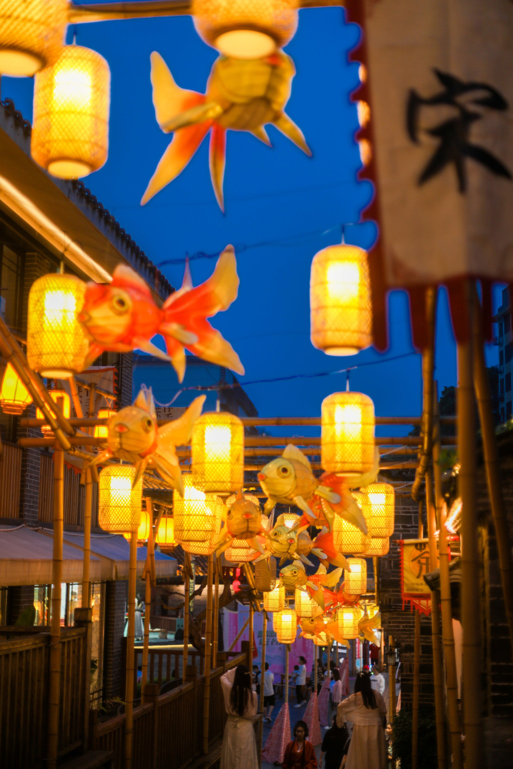 时光来到晚上, 江南 宋城更是会亮起灯光,在宋城的天空中,能看到各种精致的灯饰,从飞龙到鲤鱼,精致的彩灯给宋城带来了更多缤纷的色彩,和那份繁华的人间烟火气。