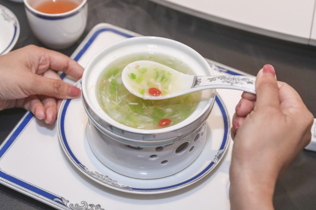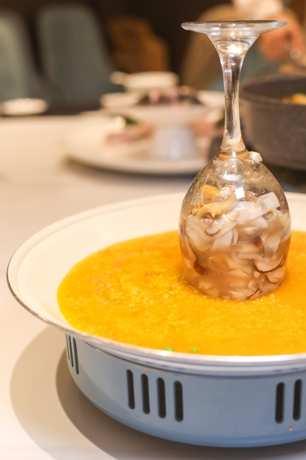 小米用金汤熬制,已经非常鲜甜。先吃小米,然后拿开玻璃杯,玻璃杯中放置了鲍鱼片和响螺片,鲜甜爽口。
