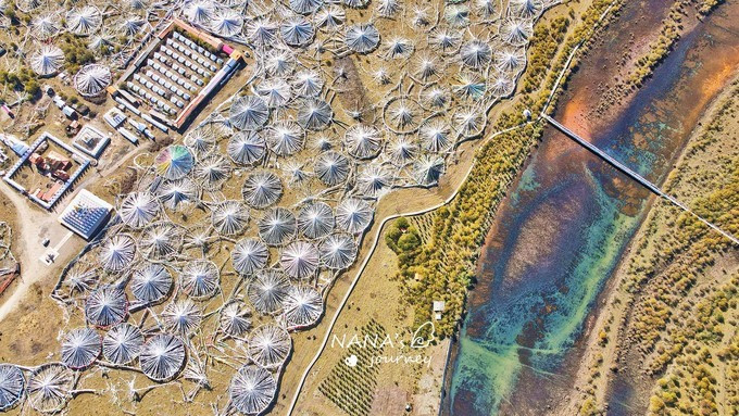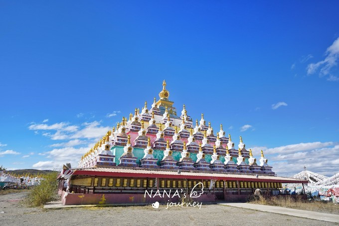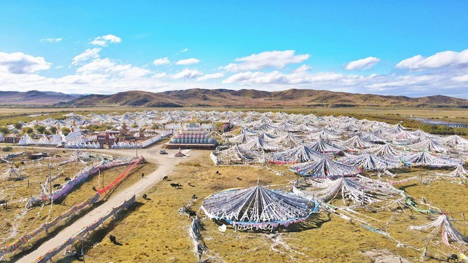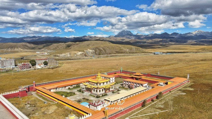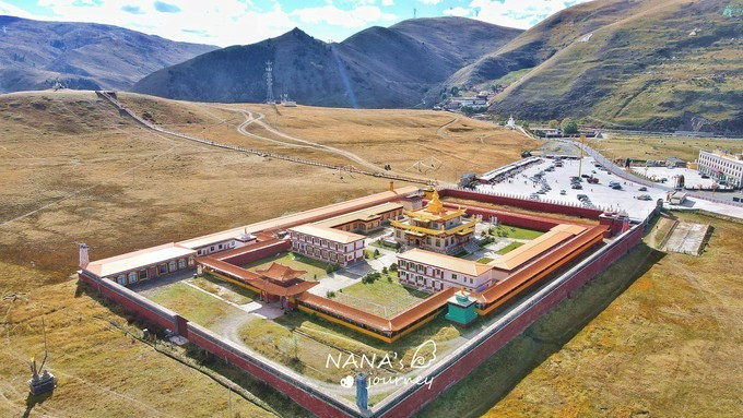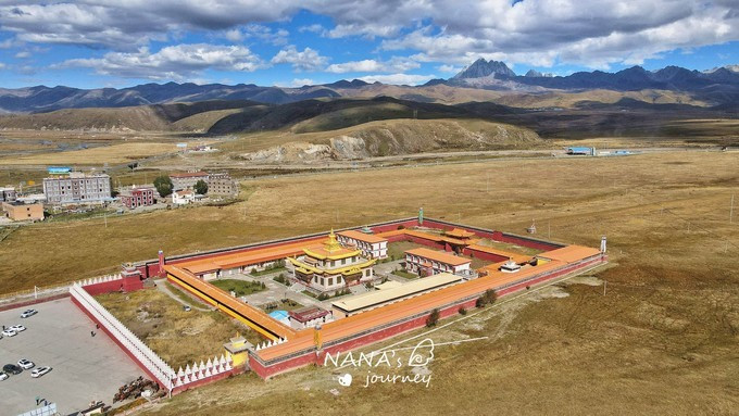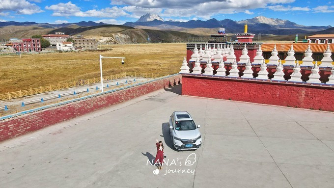 塔公草原上的寺庙是木雅金塔,但草原如今被封了路无法进入,只能把车停在停车场,而我们也没打算进这个要收15元清理费的寺庙,唯一可以和木雅金塔和雅拉雪山合照的最佳机位,果然航拍是最佳视角。