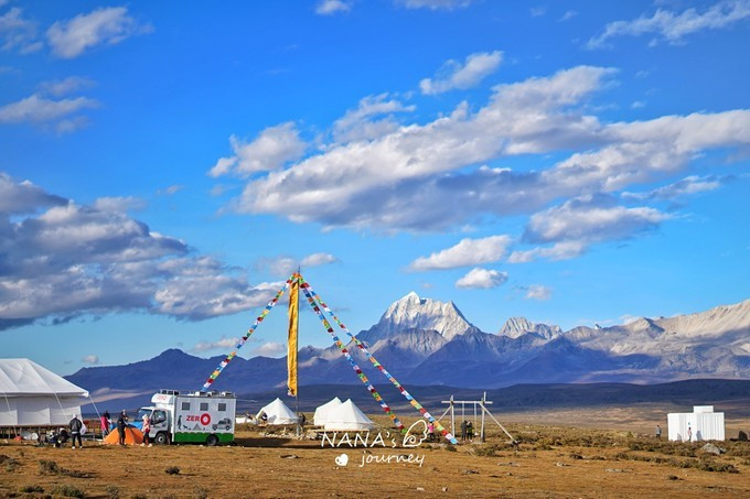 曲莫贡的山顶非常平坦,视野也很好,一圈可以看到川西地区的各大著名雪山,引得我们感叹声连连。如今这里也是户外营地,有着很文艺的帐篷屋和雪山晚餐桌,各种文艺到不行的设施,都让我们赞不绝口。