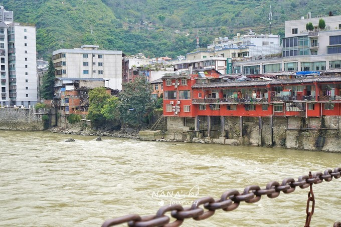 在泸定桥上静看大渡河两岸的泸定市貌,以及湍急的大渡河。