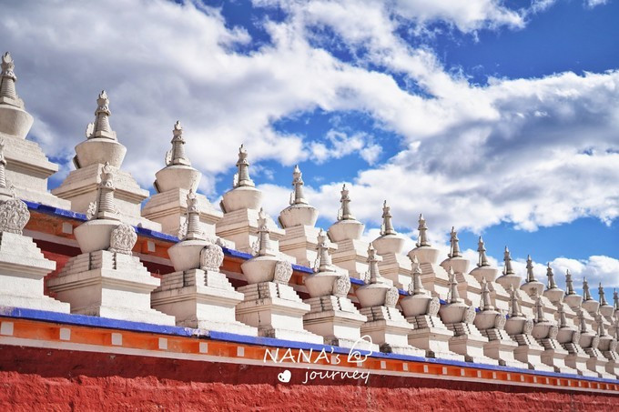 木雅金塔的外墙是红色和两排白塔组成,撞色的搭配非常的醒目,很是好看。从这一面看雅拉雪山,雪就不是很多了,有点可惜了~