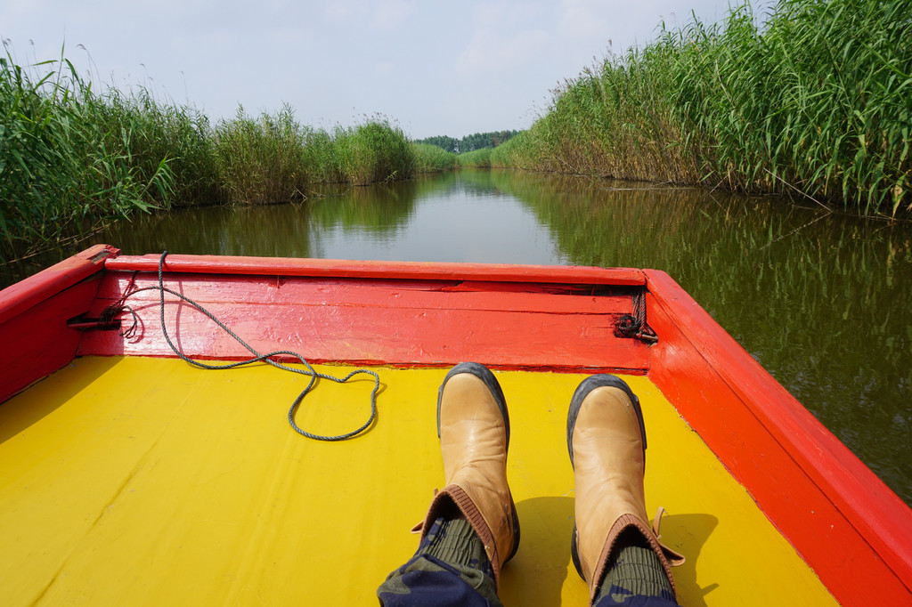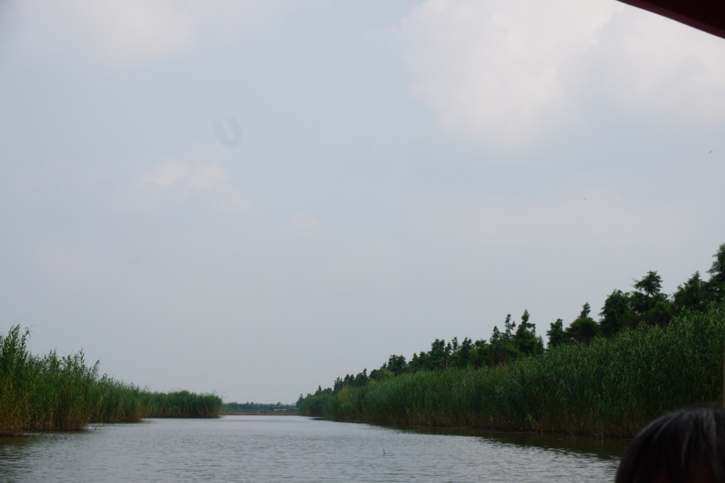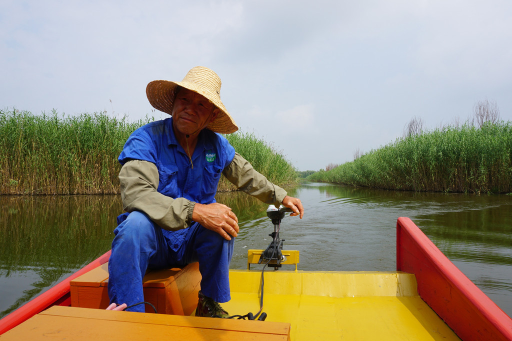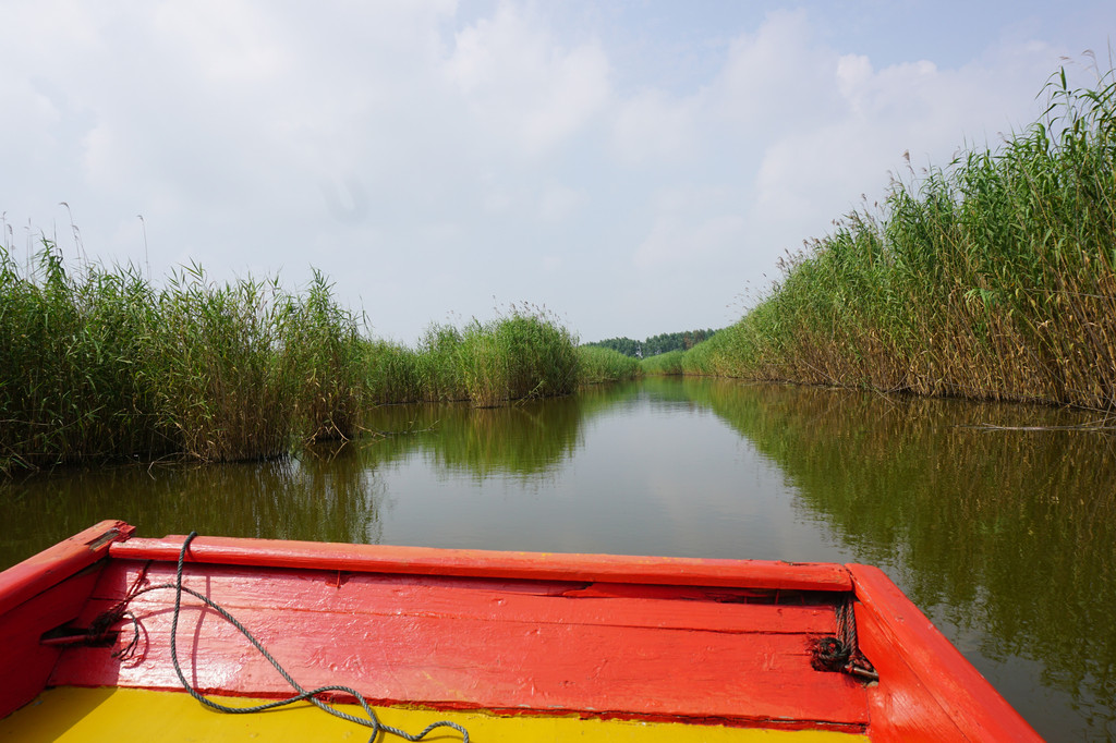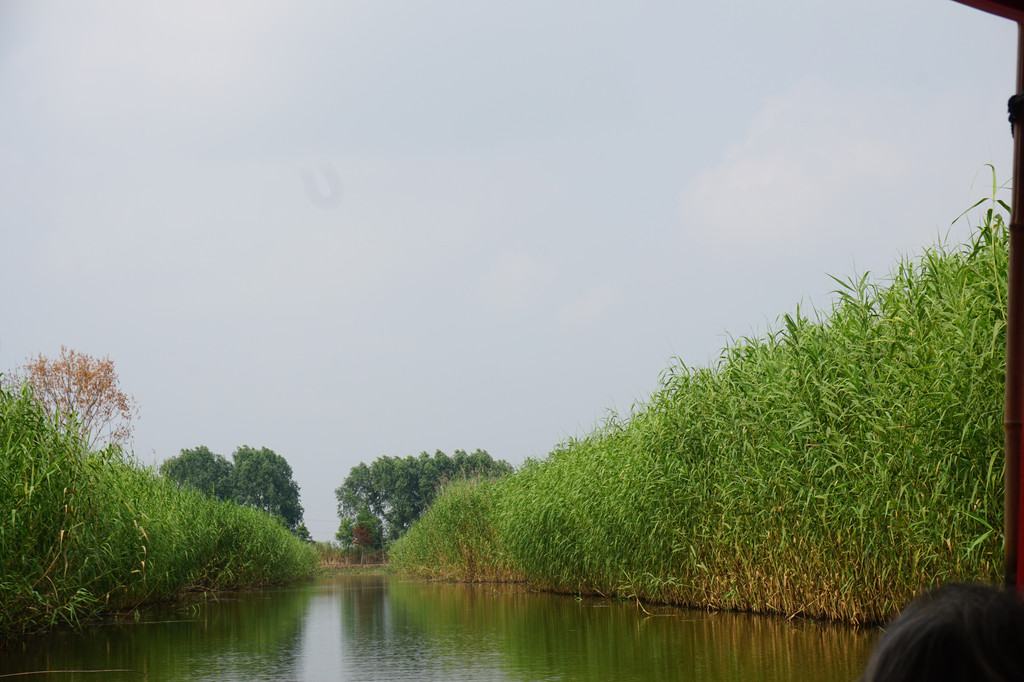 小船缓慢地行驶中,船只划出水波声。两旁的芦苇杆不时在船边擦过,发出沙沙的声音。除此之外这里是安静的。五万亩的芦苇地中,只有我们两只游船行驶着。迷宫中船工各自自由的行驶,两只游船都不曾照面。